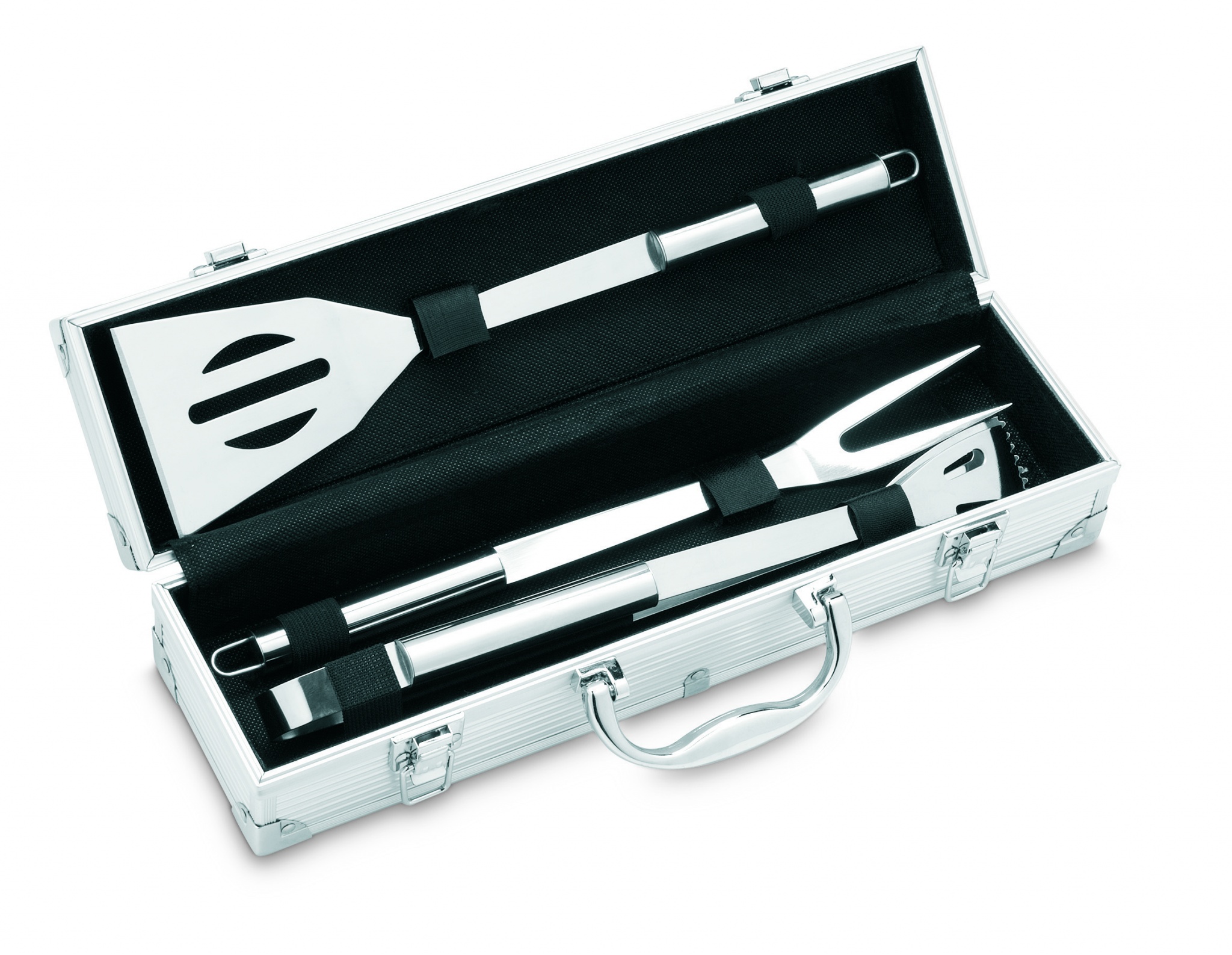 Alumiiniumist kohvris on 3 roostevabast terasest BBQ tööriista. Plaat logo jäljendamiseks.