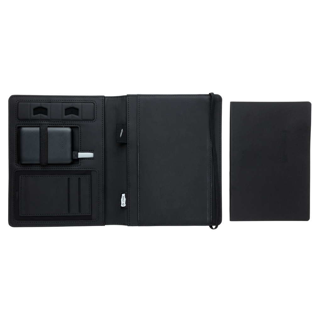 See märkmiku kaas võimaldab teil koosolekuid stiilselt pidada. Esikaanel on juhtmevaba laadimisalus teie nutitelefoni jaoks. (Androidi uusimad põlvkonnad, iPhone 8 ja uuemad). Vanemaid telefone ja tahvelarvuteid saab laadida USB-portide kaudu välise 5000 mAh toitepangaga. Sisend: 5,0V/2,1A. Väljund 1: 5,0V/2,1A. Väljund 2: 5,0 V/2,1 A. Juhtmeta väljund: 5 W. Registreeritud disain®