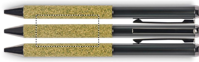 Keeratav metallist pastapliiats kangaga korpusel, mis on valmistatud 20% teepaksust, 30% korgist ja 50% polüpuuvillast. Pappkarbis. Sinine tindiga.