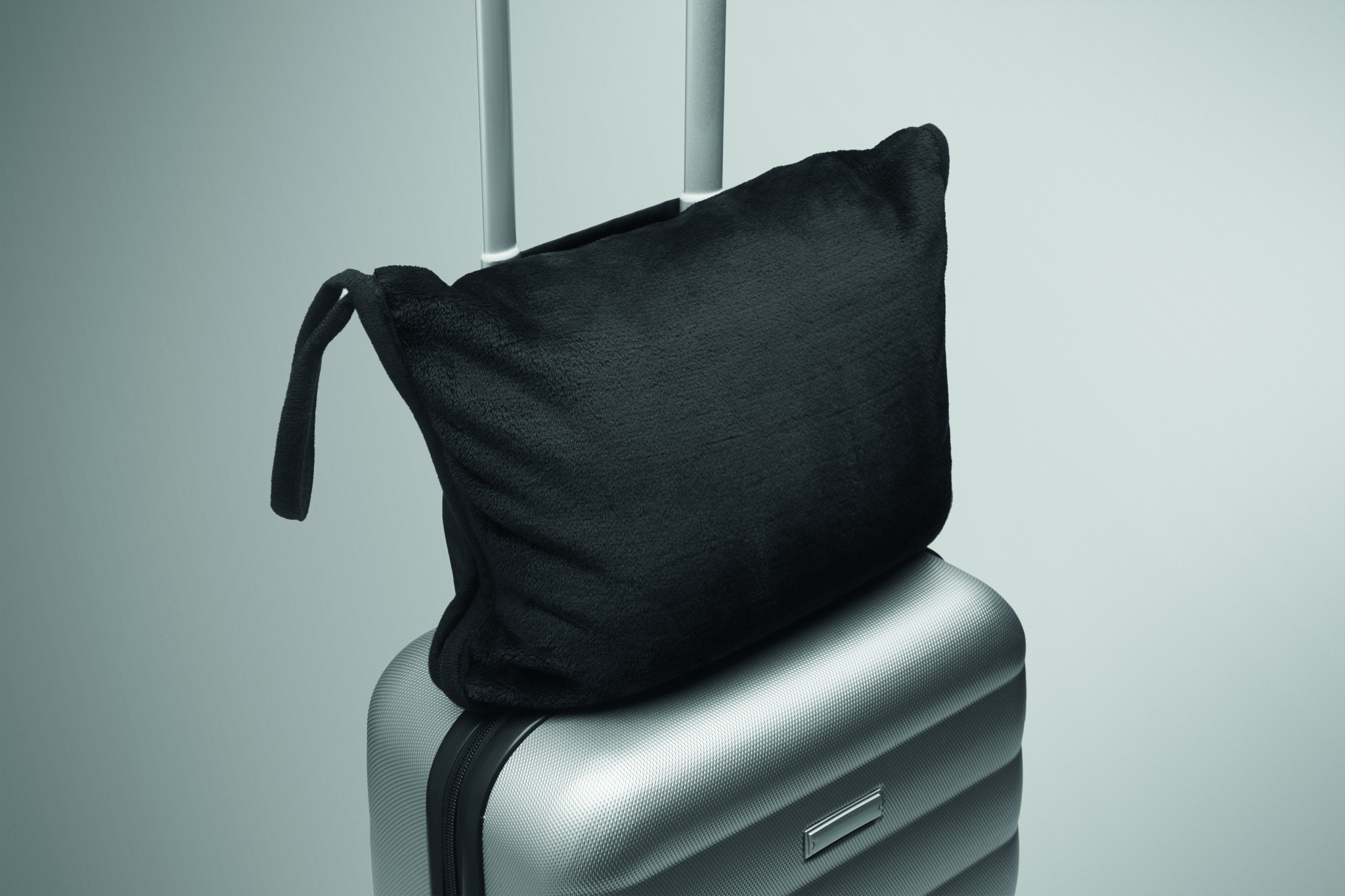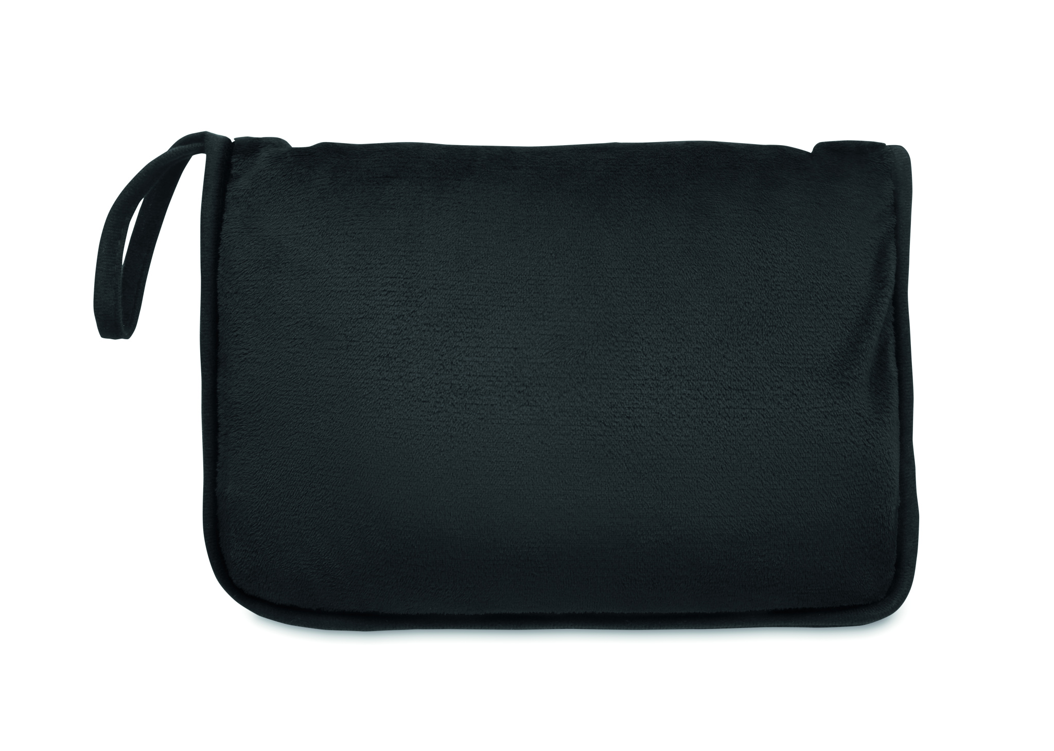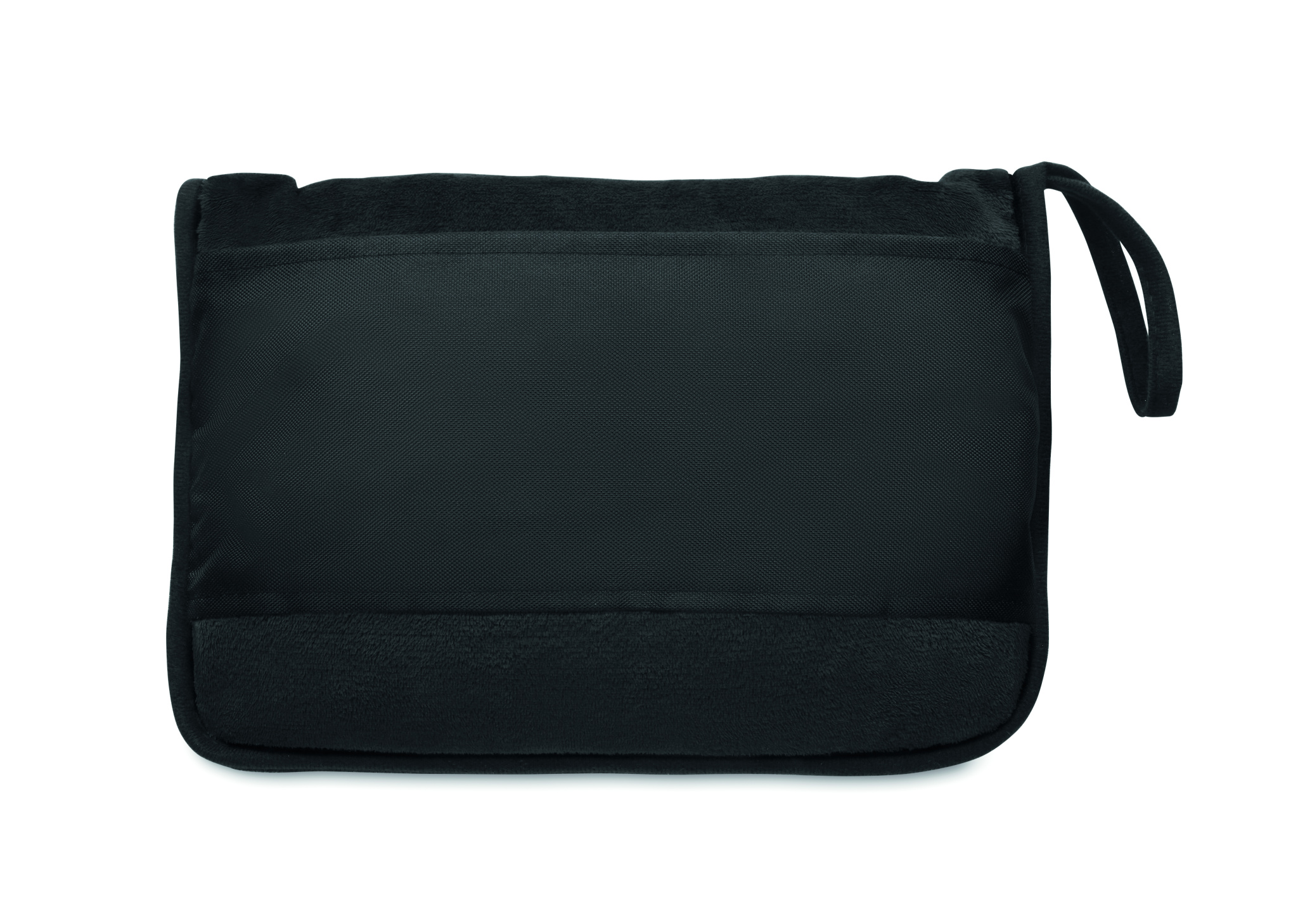 Must 2-ühes reisi flanelltekk ja/või padjakomplekt, 220 gr/m². Ese on kokkuvolditav. 600D RPET polüester õlarihm ja käepide.
