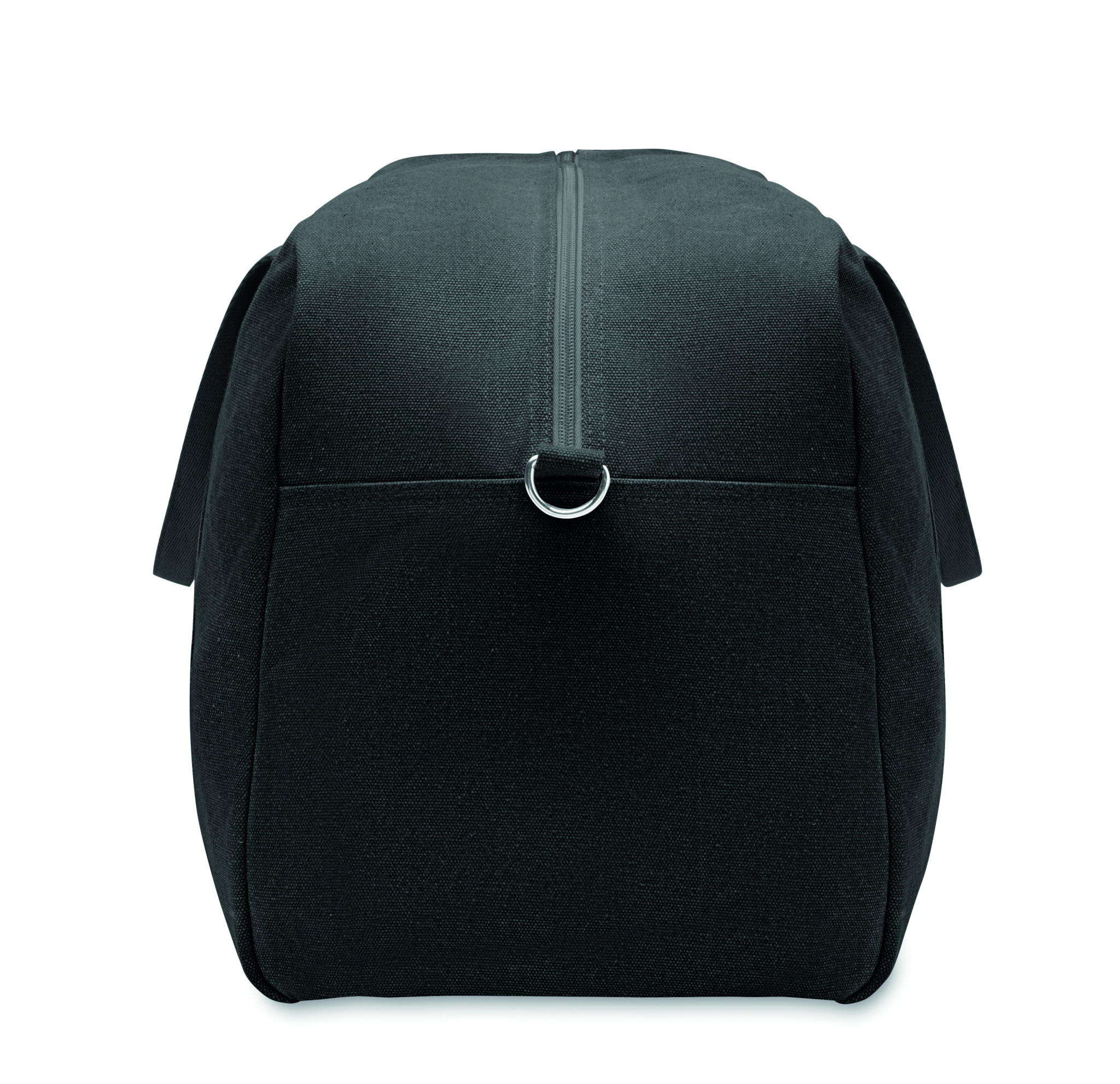 Must taaskasutatud 450 gr/m² kangast (60% taaskasutatud puuvill ja 40% taaskasutatud polüester) reisikott reguleeritava ja eemaldatava puuvillase rihmaga.