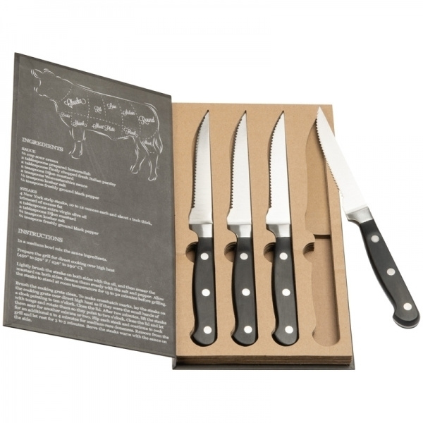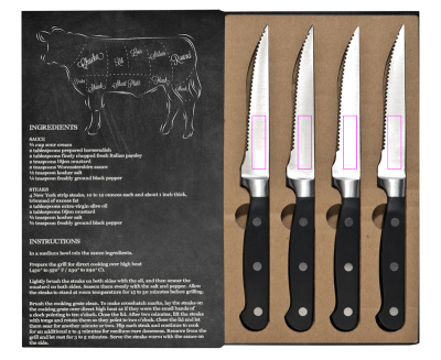 Lugu lihast! Täiusliku steigi jaoks vajate ideaalseid nuge, vastasel juhul näeb teie praad enam-vähem välja nagu hakkliha. See steigi nugade komplekt on valmistatud roostevabast terasest ja kvaliteet on lihtsalt suurepärane. Pakkimine muudab komplekti veelgi paremaks. Trükime teie logo pakendile tampooniga.