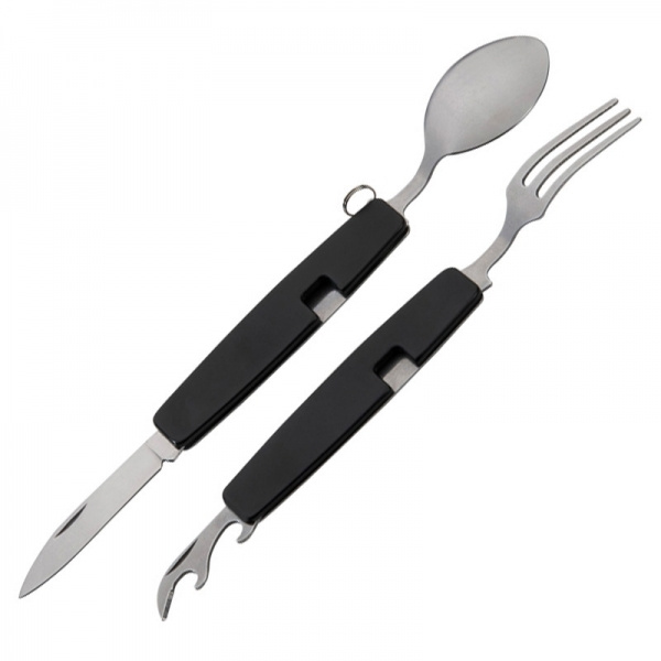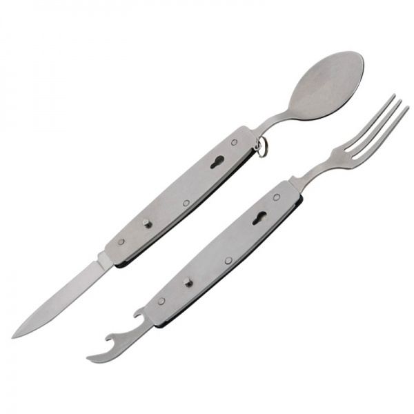 Kaheosalised roostevabast terasest matkasöögiriistad. Selle saab keskelt poolitada, nii et saate noa ja kahvli või pudeliavaja ja lusika. Graveerime teie logo ühele küljele.