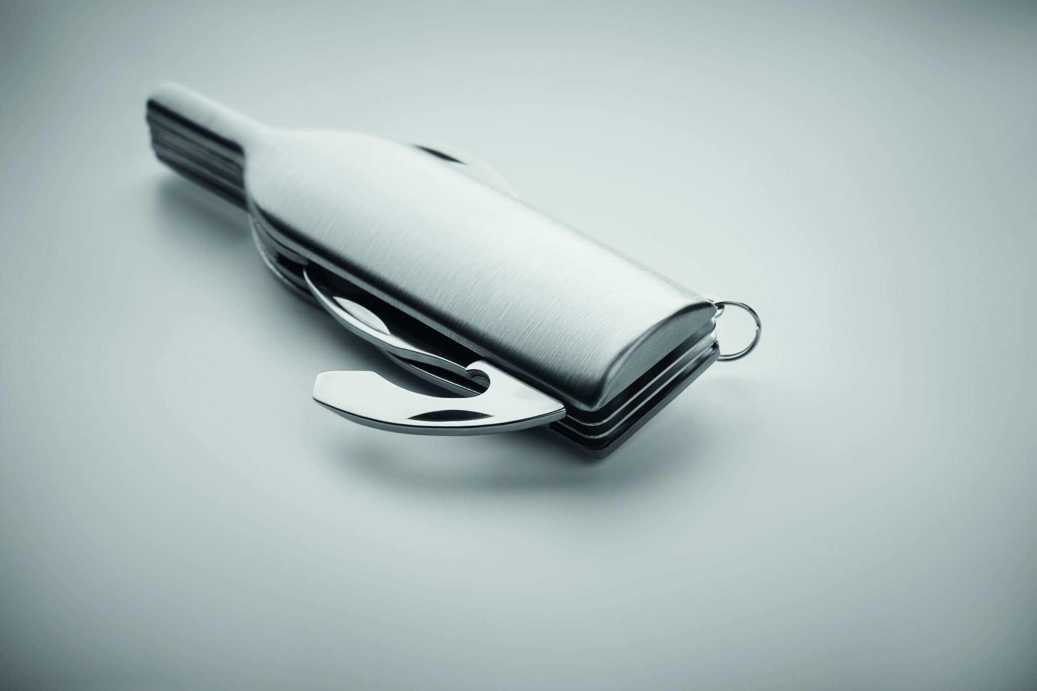 Roostevabast terasest veinipudeli kujuline taskunuga 6 funktsiooniga: pudeliavaja, nuga, korgitser, fooliumilõikur, luup ja võtmehoidja.
