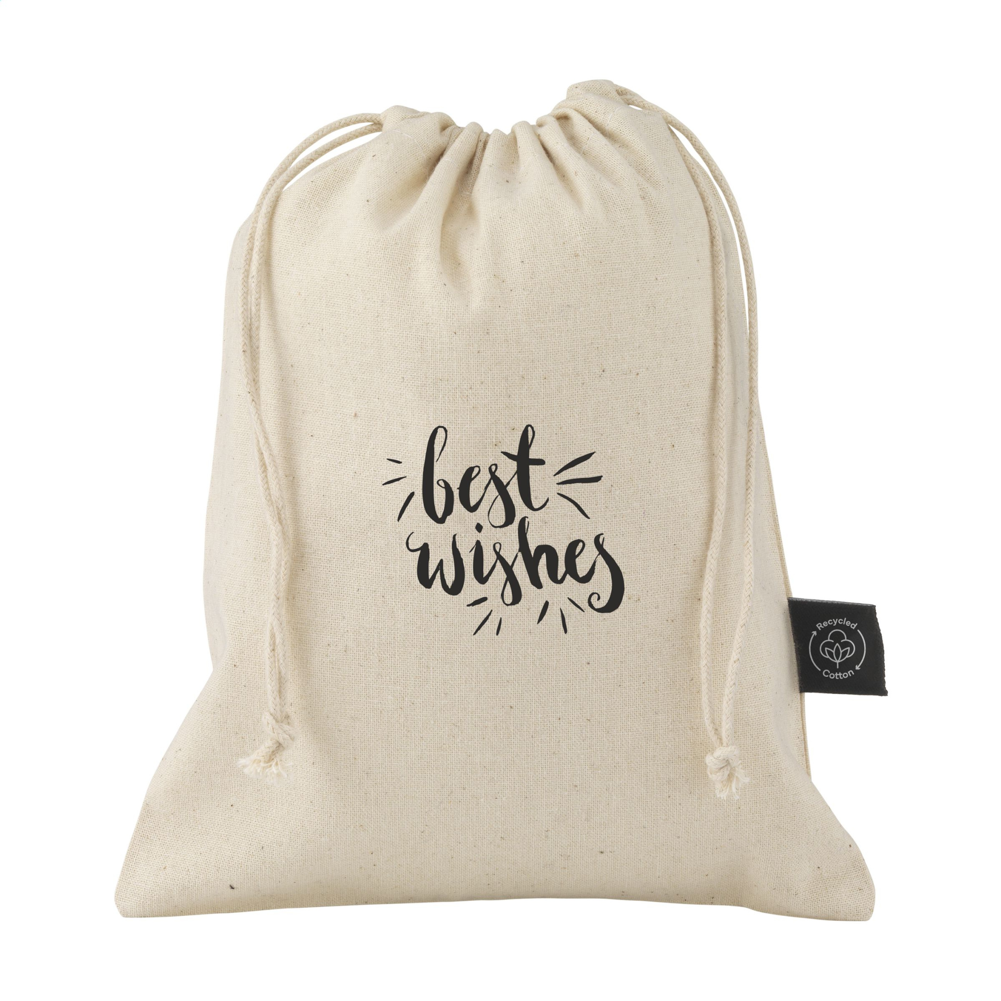 Taaskasutatud puuvillast kinkekott (150 g/m²). Taaskasutatud polüestrist ja taaskasutatud puuvillast valmistatud pingutusnööridega. Originaal kinkepakendiks ja sobib esemete hoiustamiseks. GRS-sertifikaadiga. Kokku taaskasutatud materjal: 94%. Mahutavus ca. 500 ml.