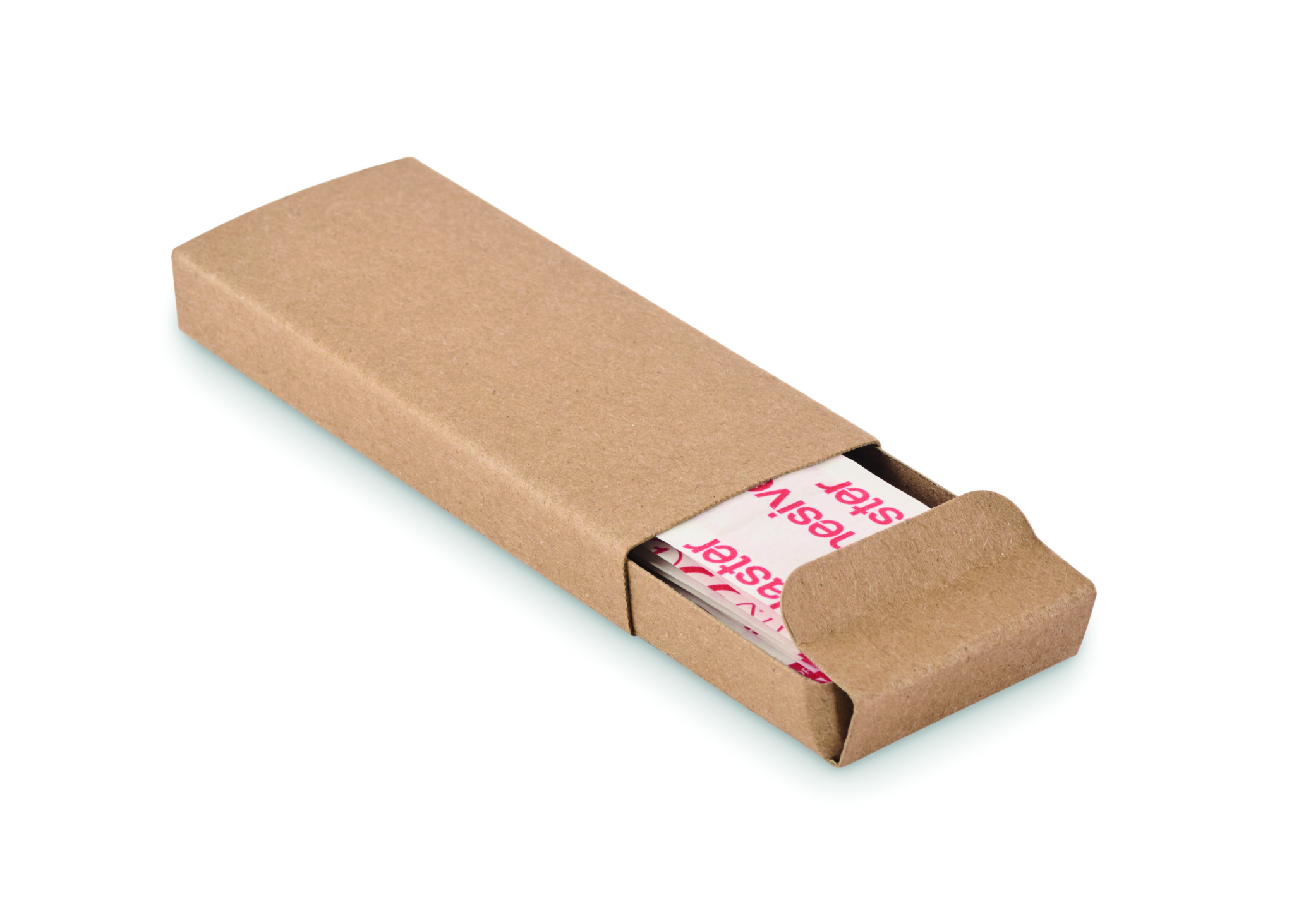 15-osaline plaastrite komplekt taaskasutatud paberist karbis. Šveitsis pole müügil.