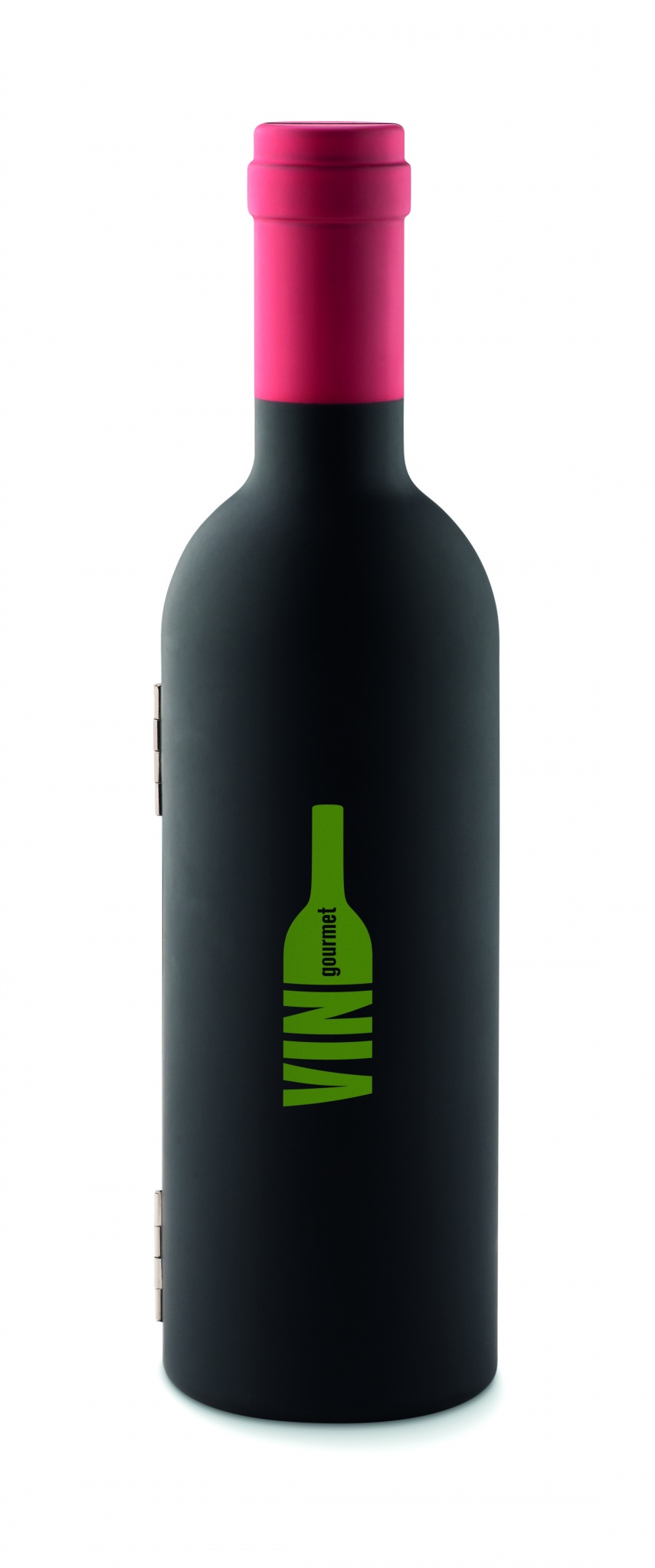 Veinikomplekt pudelikujulises karbis. Veinikorgi, korgitser ja tilkumisvastase kraega. Magnetiline sulgemine.