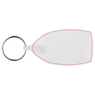 Valge ristkülikukujuline võtmehoidja metallist poolitatud võtmehoidjaga. Metallist silmusrõngas pakub lamedat profiili, mis sobib ideaalselt postitamiseks.