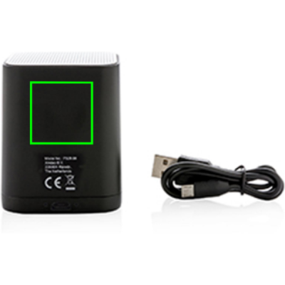 Juhtmeta 3W kõlar, mida saab kohandada teie logoga ABS-pinnal. Logo süttib teie kaubamärgi optimaalseks eksponeerimiseks. Kõlar kasutab BT 4.2 sujuvaks ühenduseks kuni 10 meetri kaugusel. Sisseehitatud 400 mAh aku võimaldab ühe laadimisega mängida muusikat kuni 4 tundi ja uuesti laadimine toimub 1 tunniga.