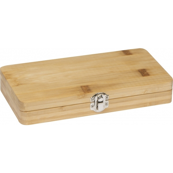 22-osainen työkalusarja, joka sisältää 3 ruuvimeisseliä, erilaisia teriä adapterineen sekä leikkurin ja 4 kuusikulmaista avainta bambukotelossa. Logosi kaiverretaan koteloon.
