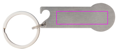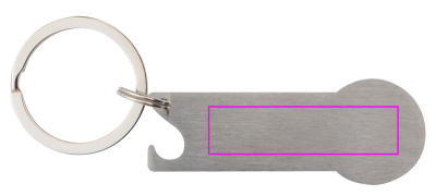 Ruostumattomasta teräksestä valmistettu avaimenperä, jossa integroitu ostoskorisiru, avaimenperä ja pullonavaaja. Logosi laseroitetaan fobiin.