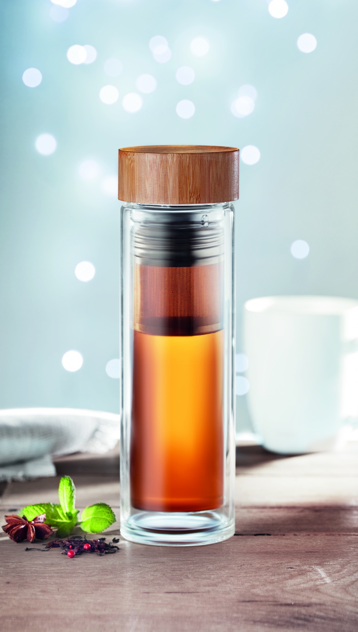 Kaksiseinäinen korkea 400 ml borosilikaattilasipullo ja bambukansi teesiivilällä. Luonnollisen materiaalin (bambu) vuoksi, tuotteiden värissä/ koossa saattaa olla erinäisyyksiä ja tämä voi vaikuttaa painatuksen lopputulokseen. Borosilikaattilasiin ei voi kaiverruttaa.