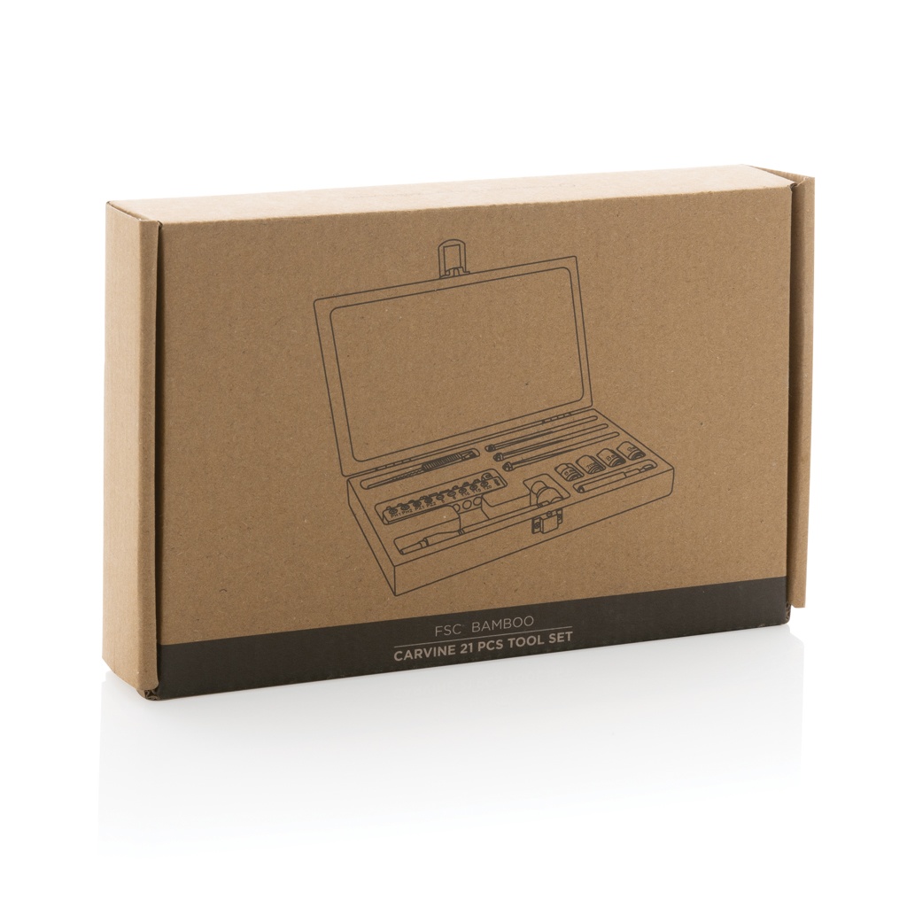 21-osainen työkalusetti ylellisellä FSC® 100% bambusta valmistetulla kotelolla. Setissä on 3 ruuvimeisseliä, 10 hylsyä pidikkeessä, 4 kärkeä, 1 kahvan, 1 liittimen ja 1 pienen leikkurin. Pakattu FSC® mix kraft-pakkaukseen.