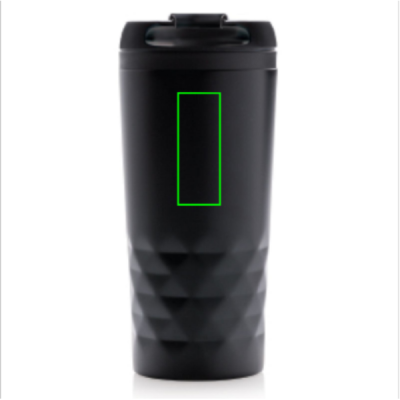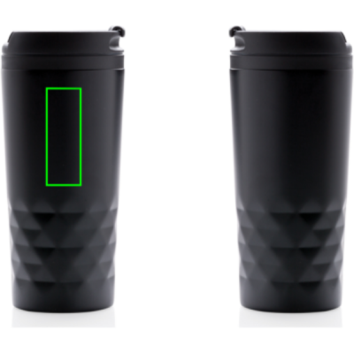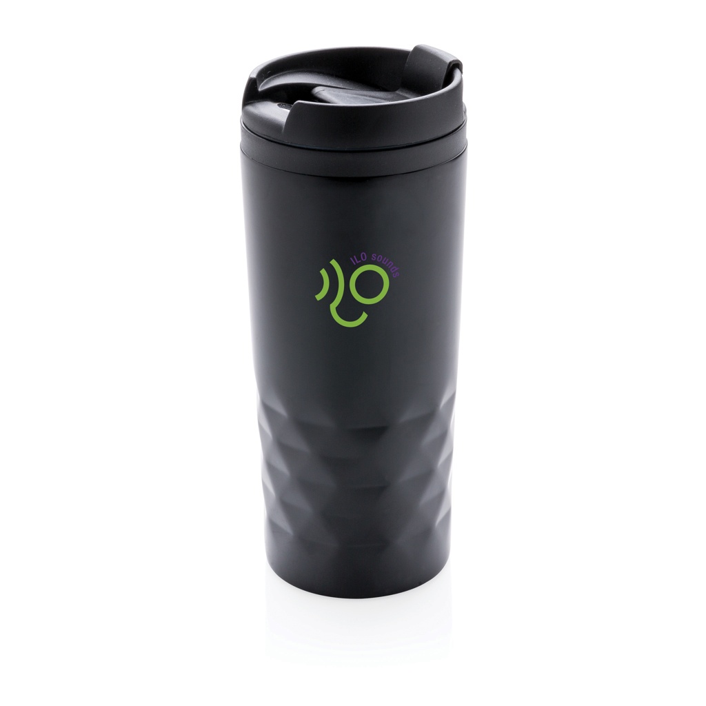 Ruostumattomasta teräksestä valmistettu trendikäs kahvimuki geometrisillä yksityiskohdilla. Sisäosa on valmistettu muovista. Vain käsinpesu. Tilavuus 300ml.