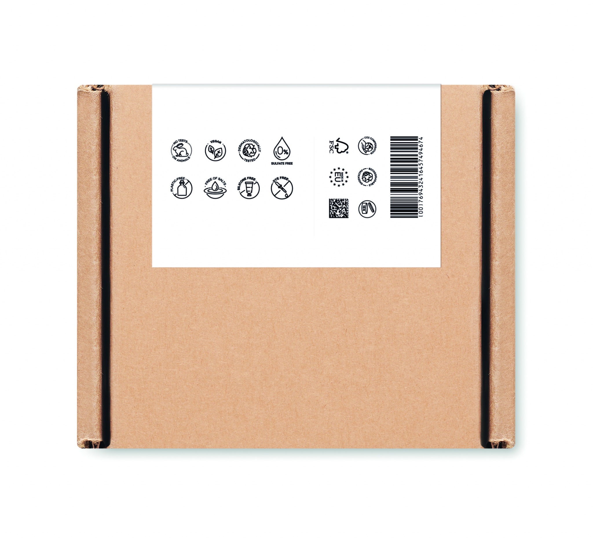 Branded By Earthin matkalahjasetti, sisältää 50 gr vegaanisen- vartalonpesuaineen, shampoon ja kasvojen kuorintaineen. Pakattuna kierrätettyyn paperirasiaan, valmistusmaa EU.