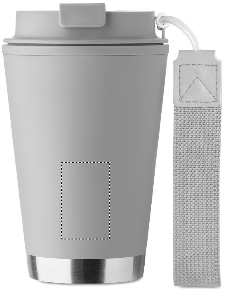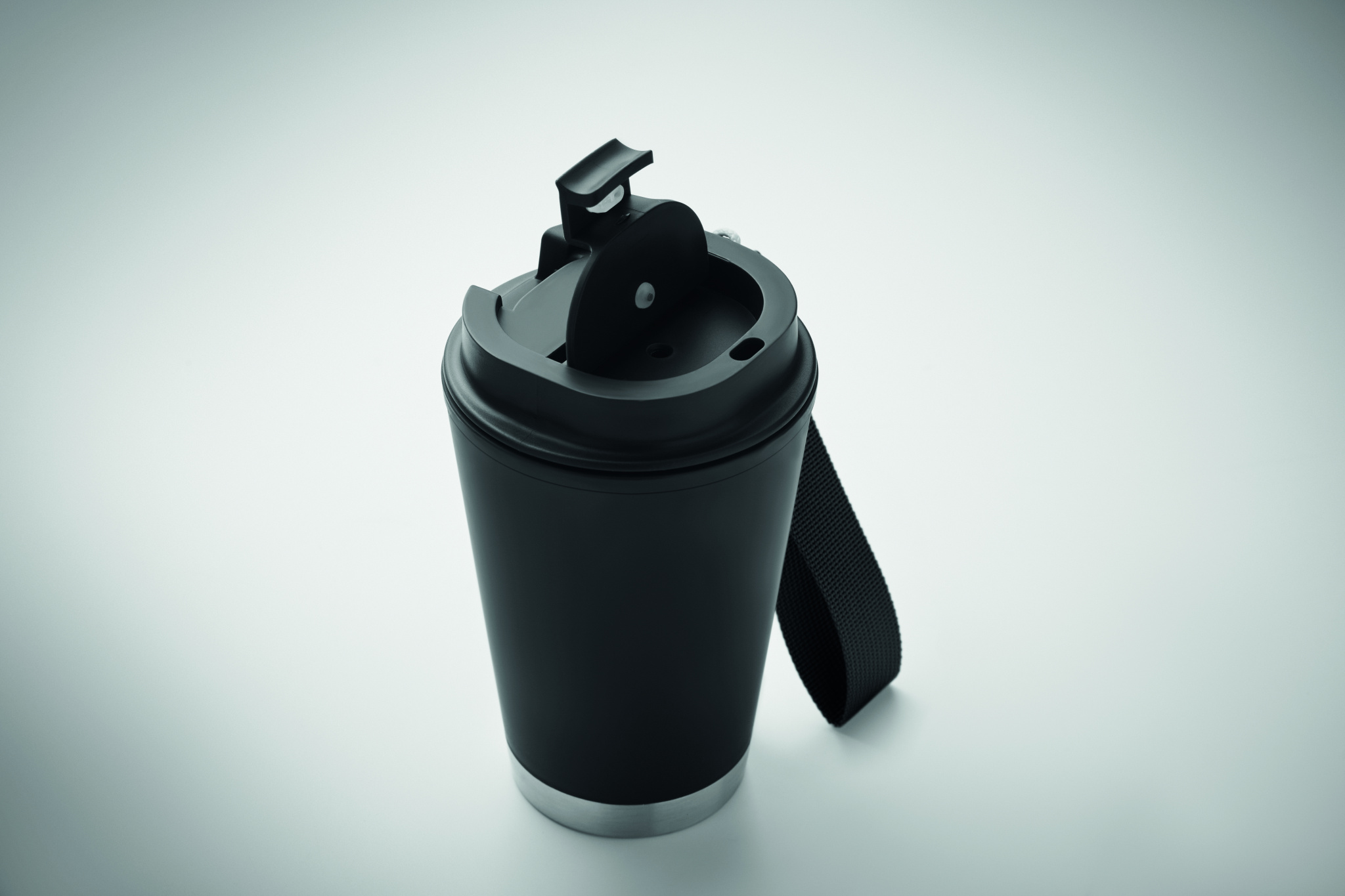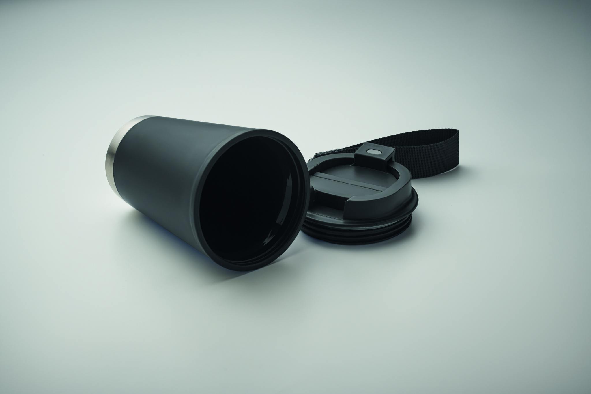 Kaksiseinäinen muki, jossa on PP-muovinen sisäosa, kierrätetystä PP-muovista valmistettu ulkoseinä, kierrätettyä ruostumatonta terästä oleva yksityiskohta sekä rannehihna kierrätetystä RPET-materiaalista. Tilavuus: 300 ml.