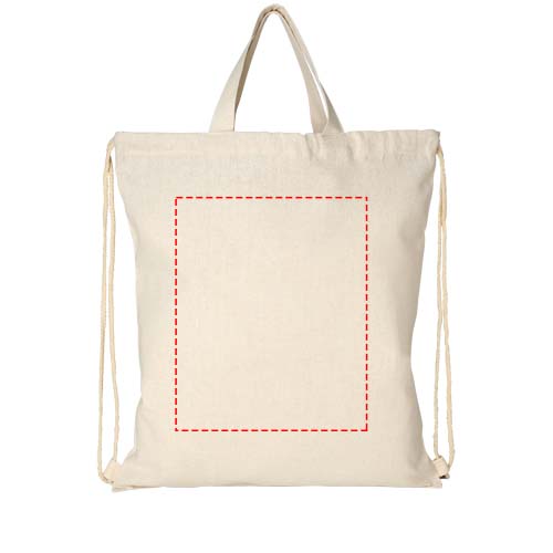 Kierrätetystä puuvillasta ja polyesteristä valmistettu kassi 210 g/m². Kierrätetty puuvilla valmistetaan valmistusmateriaalin ylijäämästä, jota syntyy tekstiilitehtaissa leikkaamisen aikana. Varsinaisen tuotteen väri saattaa vaihdella hieman tuotantoprosessin luonteen takia. Suuri päälokero ja puuvillaiset kiristysnyörit. Kaksi kahvaa, joiden korkeus on 14 cm. Kestää 5 kilon painon.