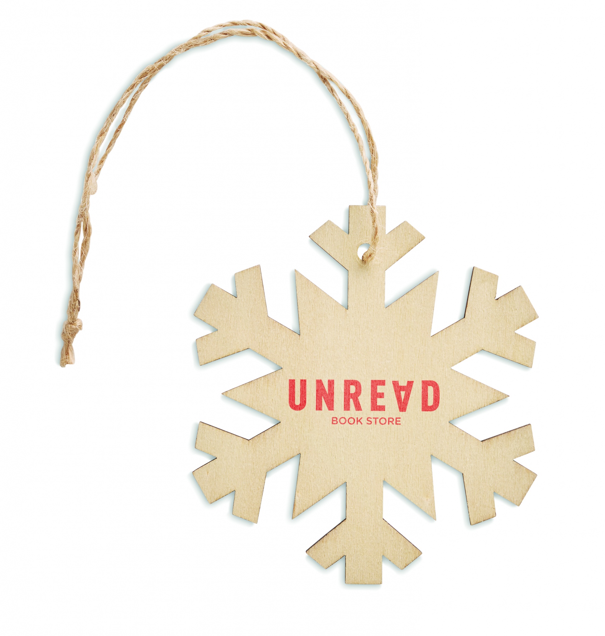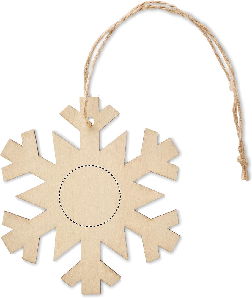 Puinen MDF lumihiutaleen muotoinen kuusenkoriste juuttilankaripustimella. Luonnollisen materiaalin (MDF) vuoksi, tuotteiden värissä/ koossa saattaa olla erinäisyyksiä ja tämä voi vaikuttaa painatuksen lopputulokseen.