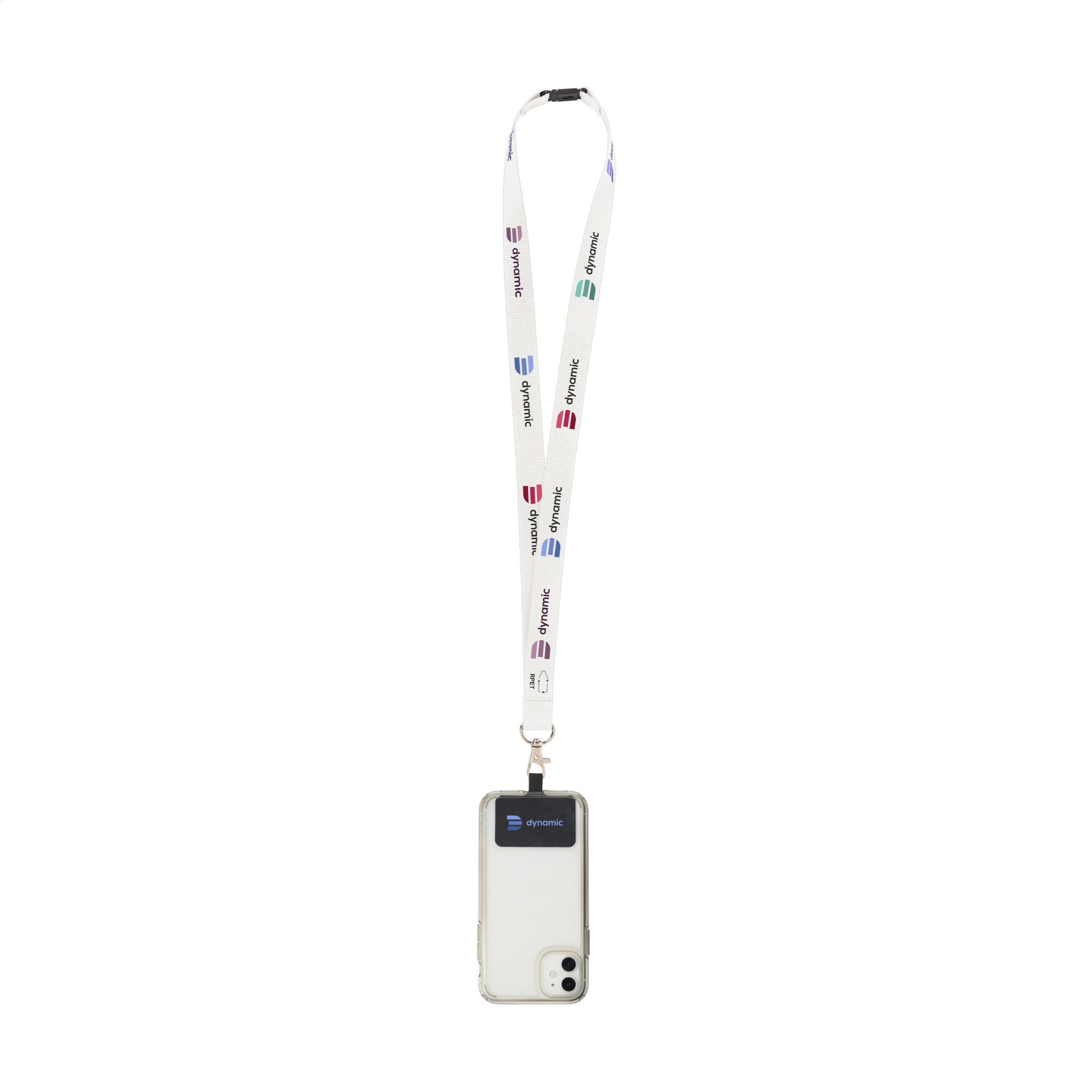Vahva kudottu RPET-polyesterinauha (valmistettu kierrätetyistä PET-pulloista). Mukana metallinen karabiini, yleismerkki ja muovinen turvalukko. Patch mahdollistaa älypuhelimen kiinnittämisen kaulanauhaan. Tämän yhdistelmän avulla voit kuljettaa älypuhelintasi turvallisesti kaulassasi. Tämä varmistaa, että sinulla on puhelin nopeasti käsillä ja voit pitää kätesi ja vaatetaskut vapaina. Tämä patch on yhteensopiva useimpien älypuhelinten ja koteloyhdistelmien kanssa, mutta ei koteloiden kanssa, joissa on avoin pohja. Järjestelmä on suunniteltu siten, että puhelimesi latausportti ei tukkeudu, vaikka se olisi kiinnitetty kaulanauhaan. Sisältää täysvärisen sublimaatiopainatuksen kaulanauhassa. Valmistettu Euroopassa.