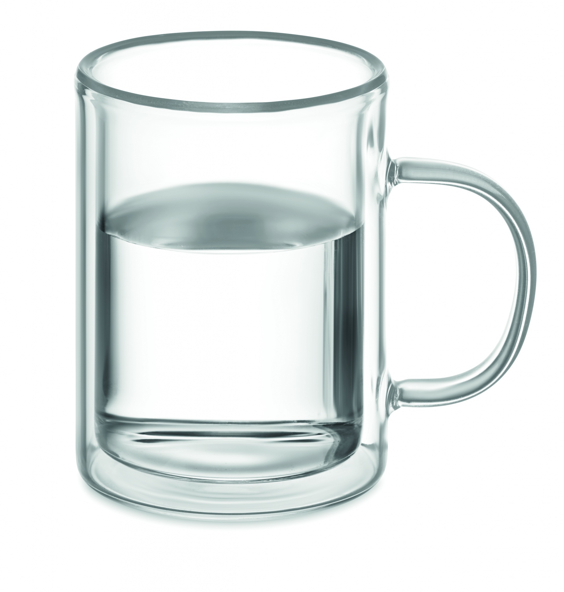 Kaksiseinäinen lasimuki, jonka tilavuus on 225 ml ja jossa on erikoispinnoite sublimaatiota varten.