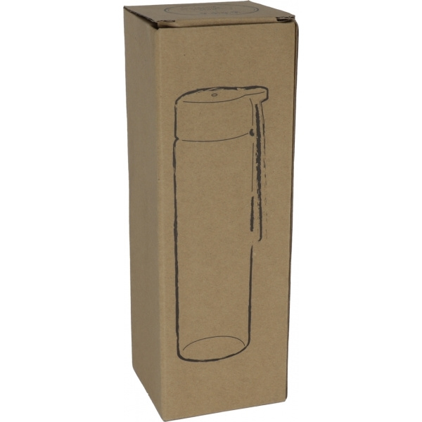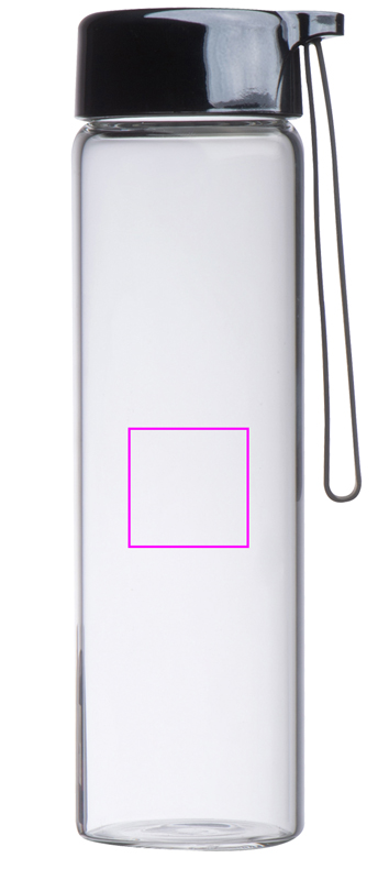 Lasipullo PP-kannella ja täyttökapasiteetti 450 ml. Logosi kaiverretaan lasiin.