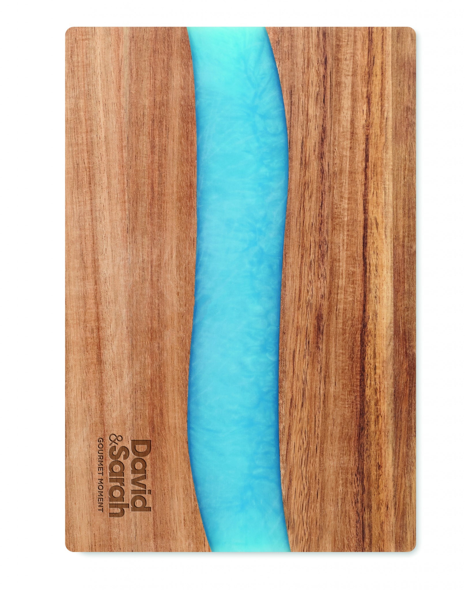 Leikkuulauta akaasiapuusta, jossa on epoksihartsi koristelu.