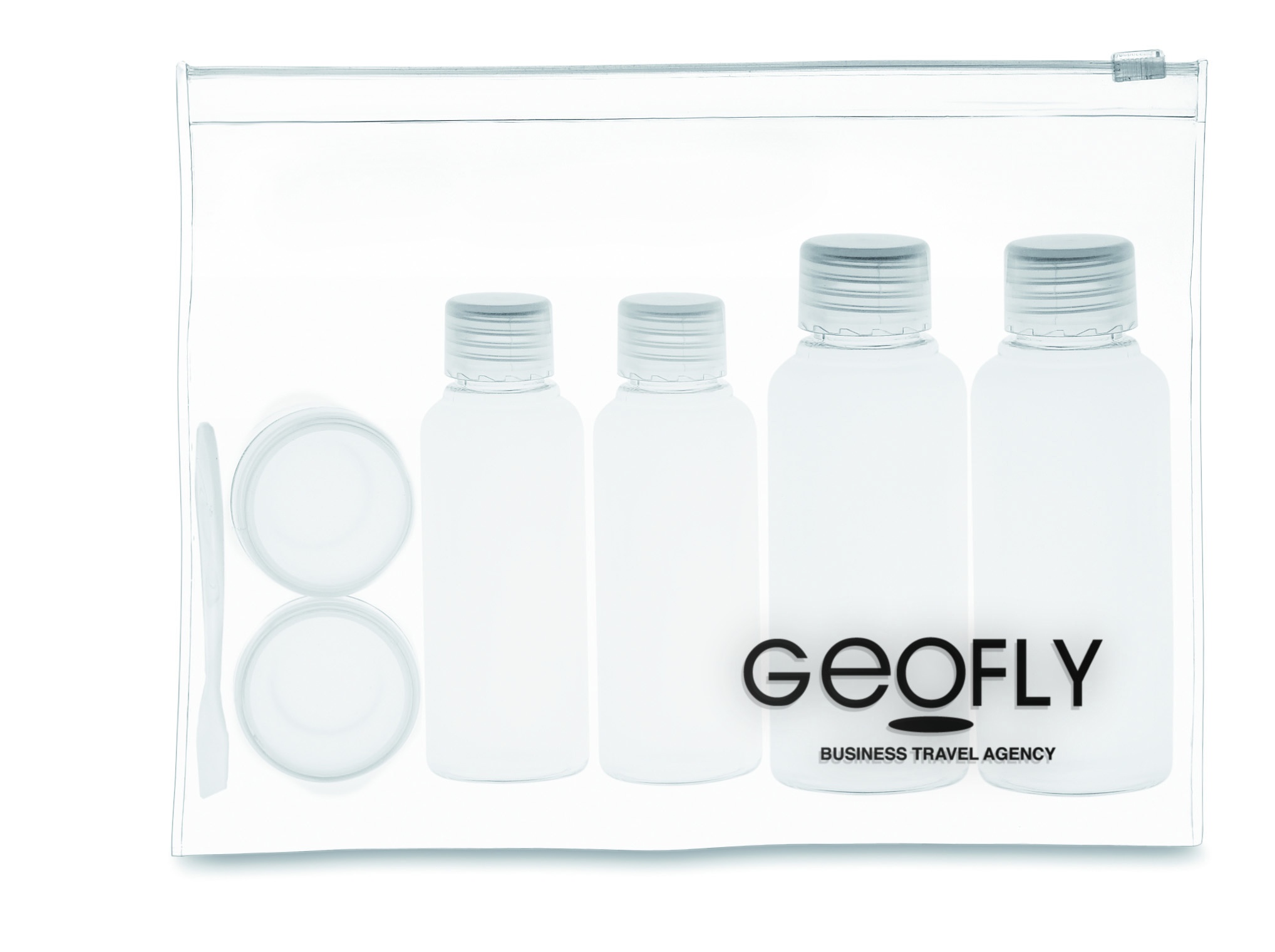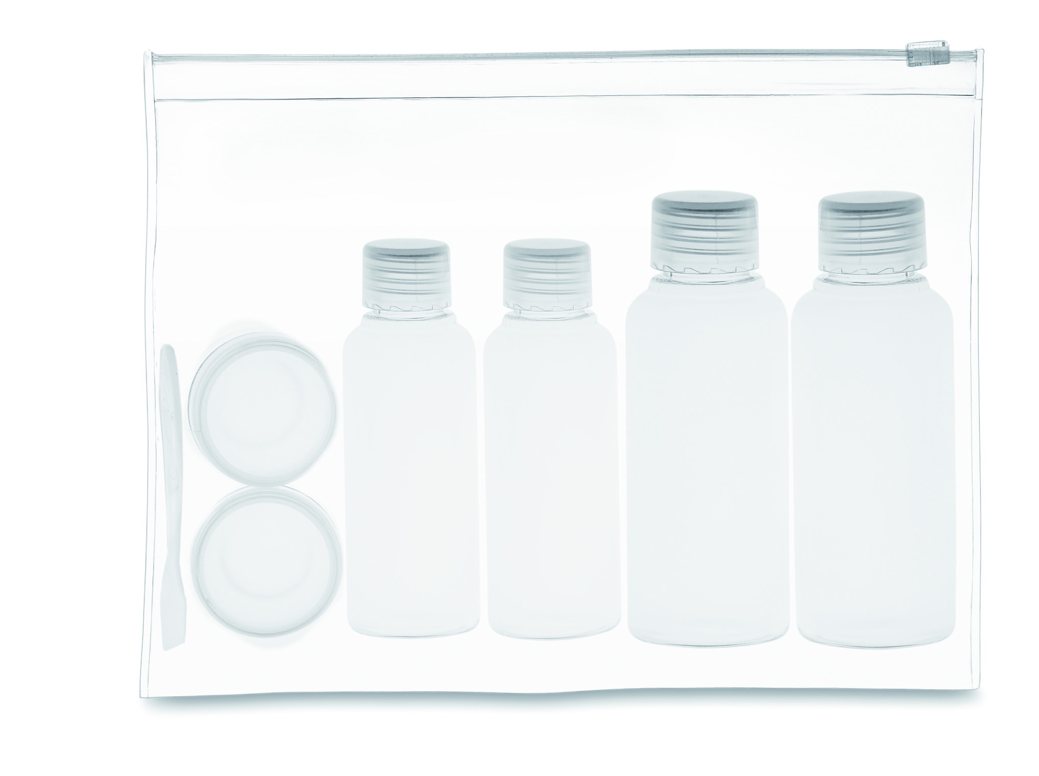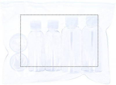 Lentomatkustuspussi, 6 tyhjää pulloa. ( 100 ml, 50 ml, ja 10 ml)