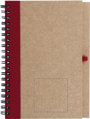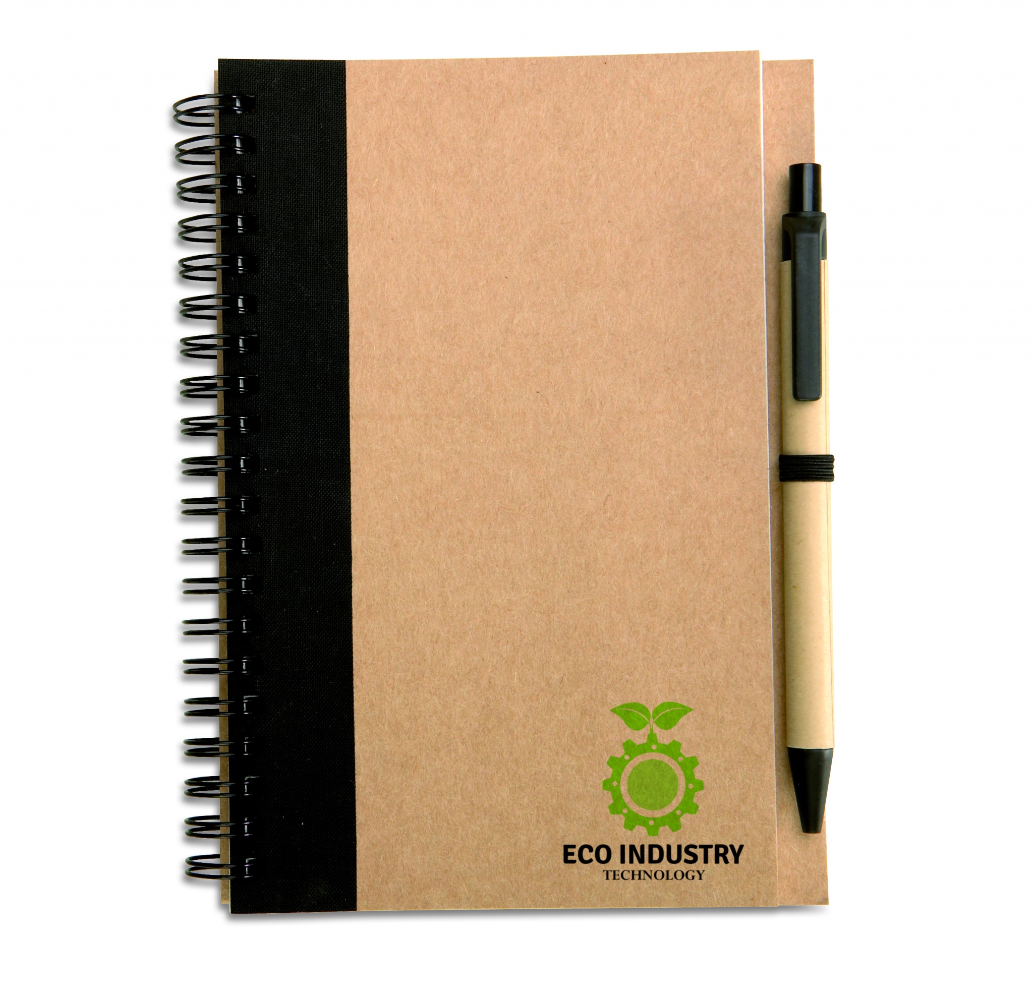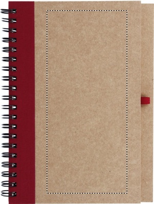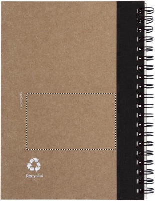 Muistikirja lehtiöllä. 70 sivua kierrätettyä paperia ja kuulakärkikynä valmistettu kierrätyspahvista, biohajoavilla muoviosilla. Sininen muste.