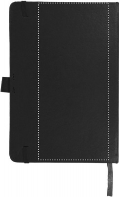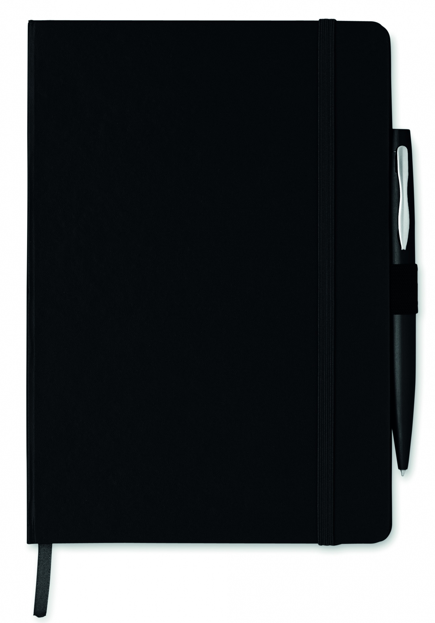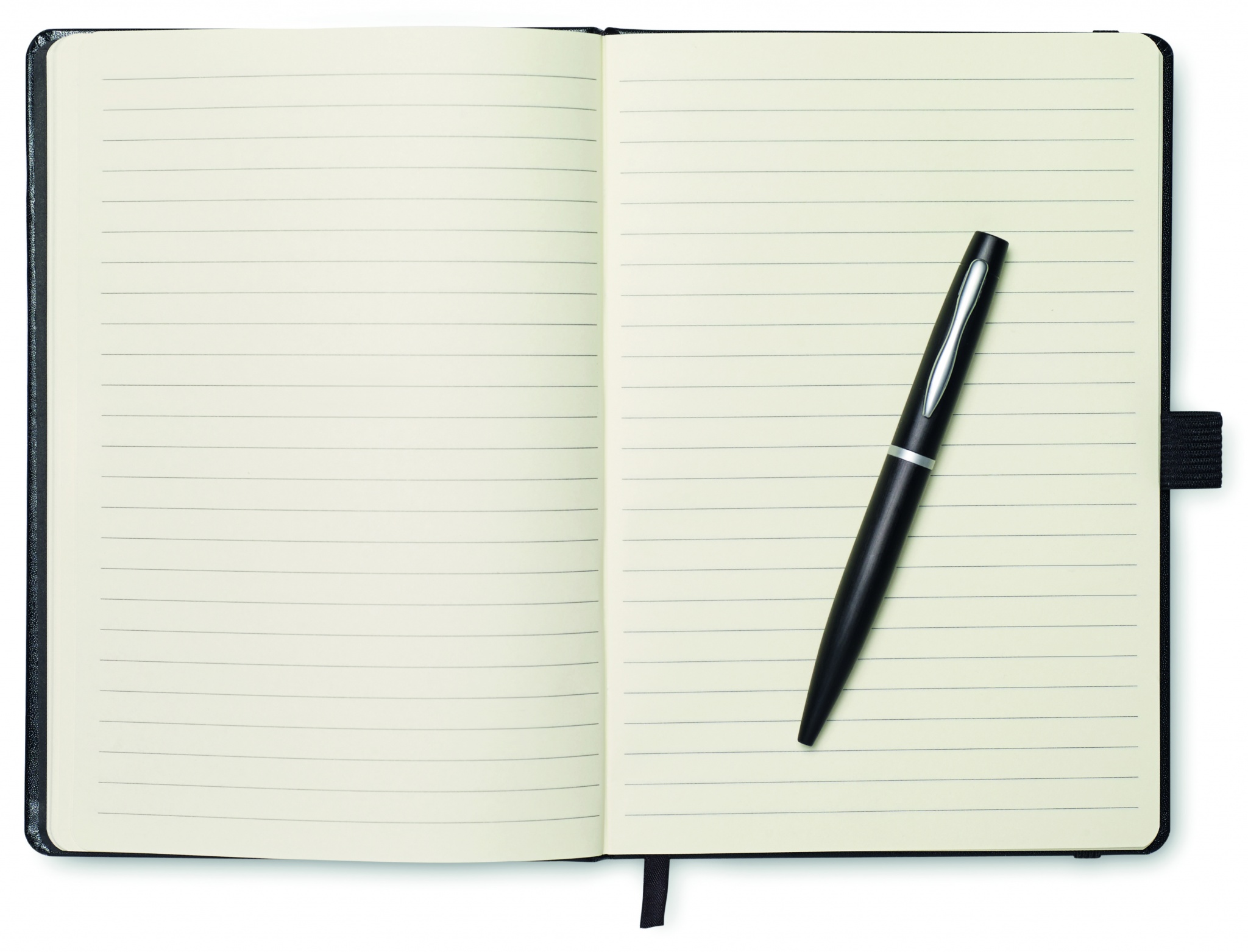 A5-muistikirja kartonki kannella, 72 sivua viivattua paperia, kuminauhalla ja kirjanmerkkinauhalla. Sisältää metallisen kuulakärkikynän sinisellä musteella.