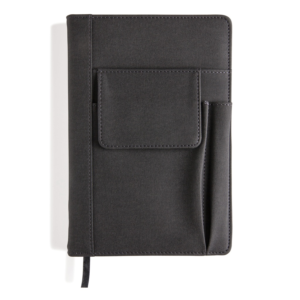 Päällystetty PU-muistikirja, jossa etutasku puhelimelle (14x10cm), tasku kynälle ja päätasku esimerkiksi varavirtalähteelle tai käyntikorteille. Musta sivunjakaja ja 160 sivua 80g/m2. A5 lehtiö kansien sisällä vaihdettavissa.