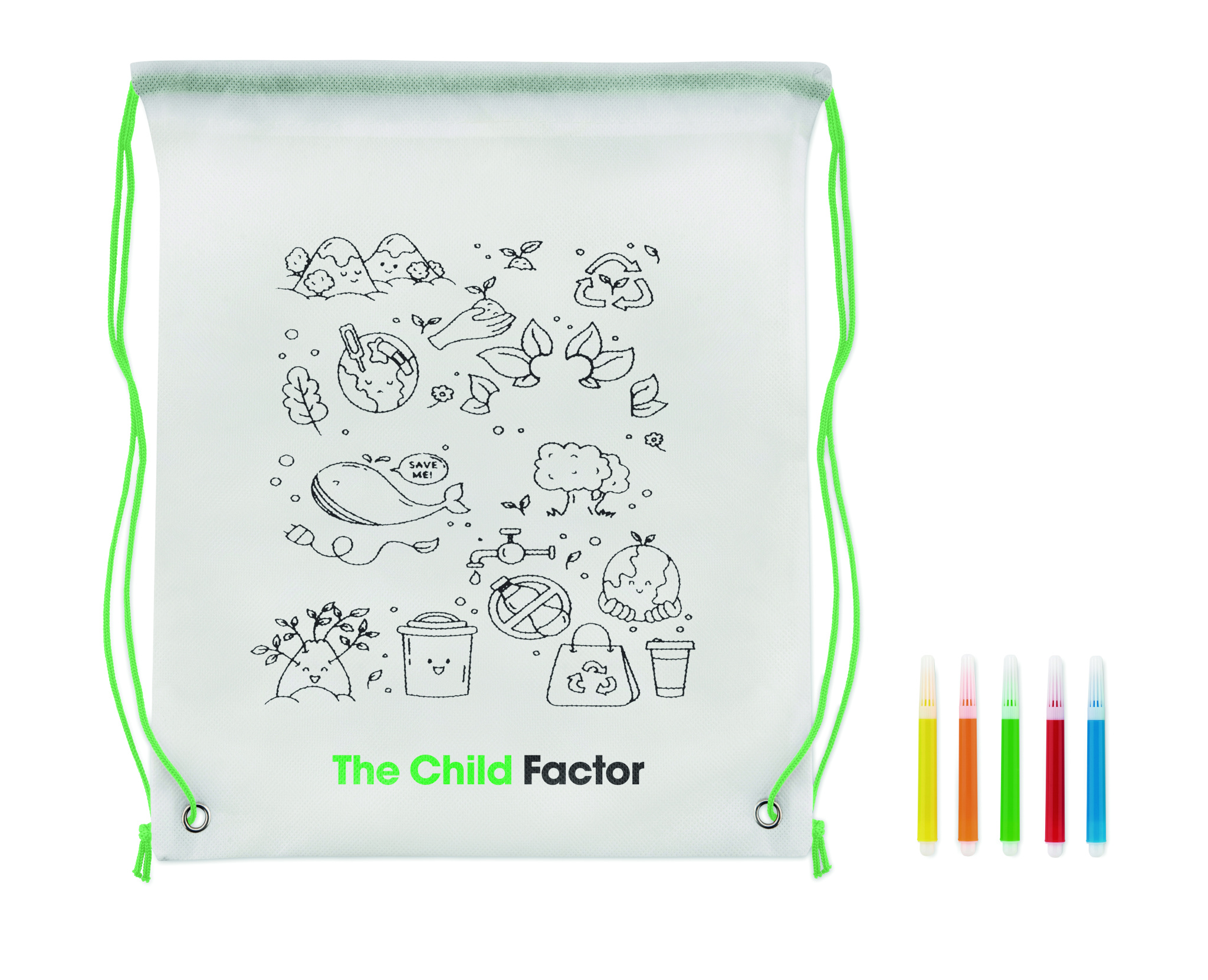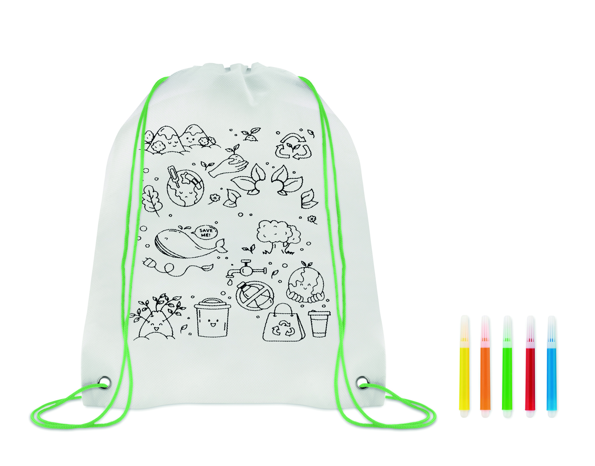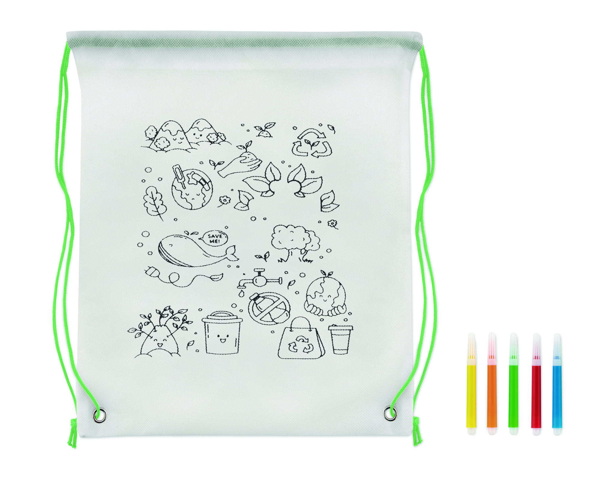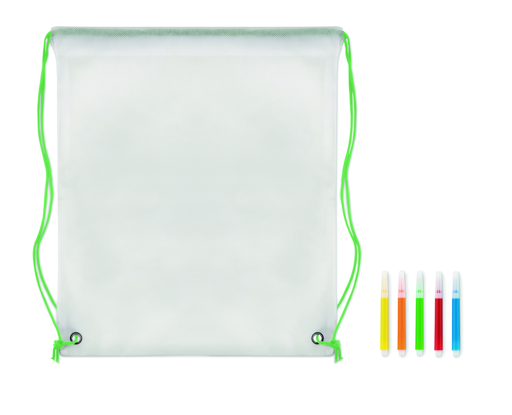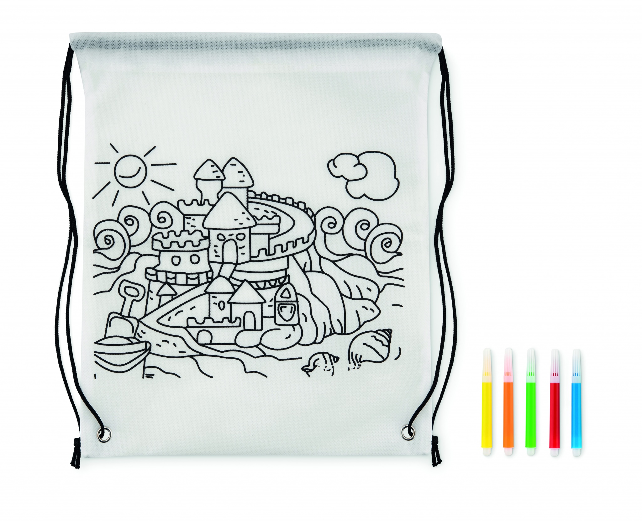 80 gr/m² kuitukangas narureppu, 5 väri kynällä ja repussa värityskuva.