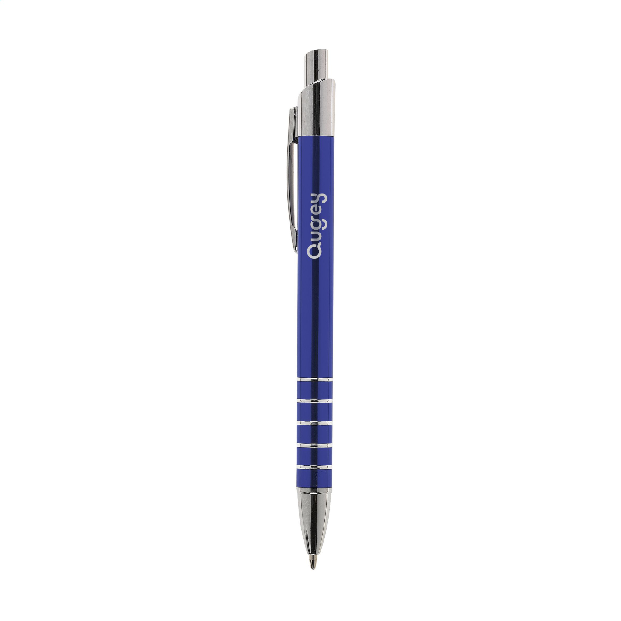 Sininen muste, metallinhohtoinen alumiininen kuulakärkikynä, metalliklipsi ja reunukset.