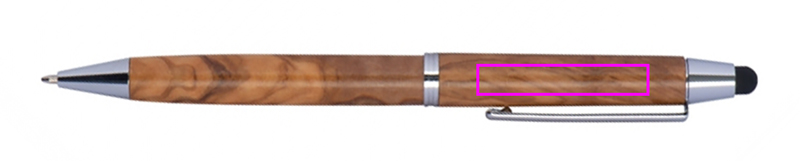 Oliivipuusta valmistettu kuulakärkikynä, kosketustoiminto ja sininen kirjoitustäyttö. Logosi kaiverretaan klipin alle.