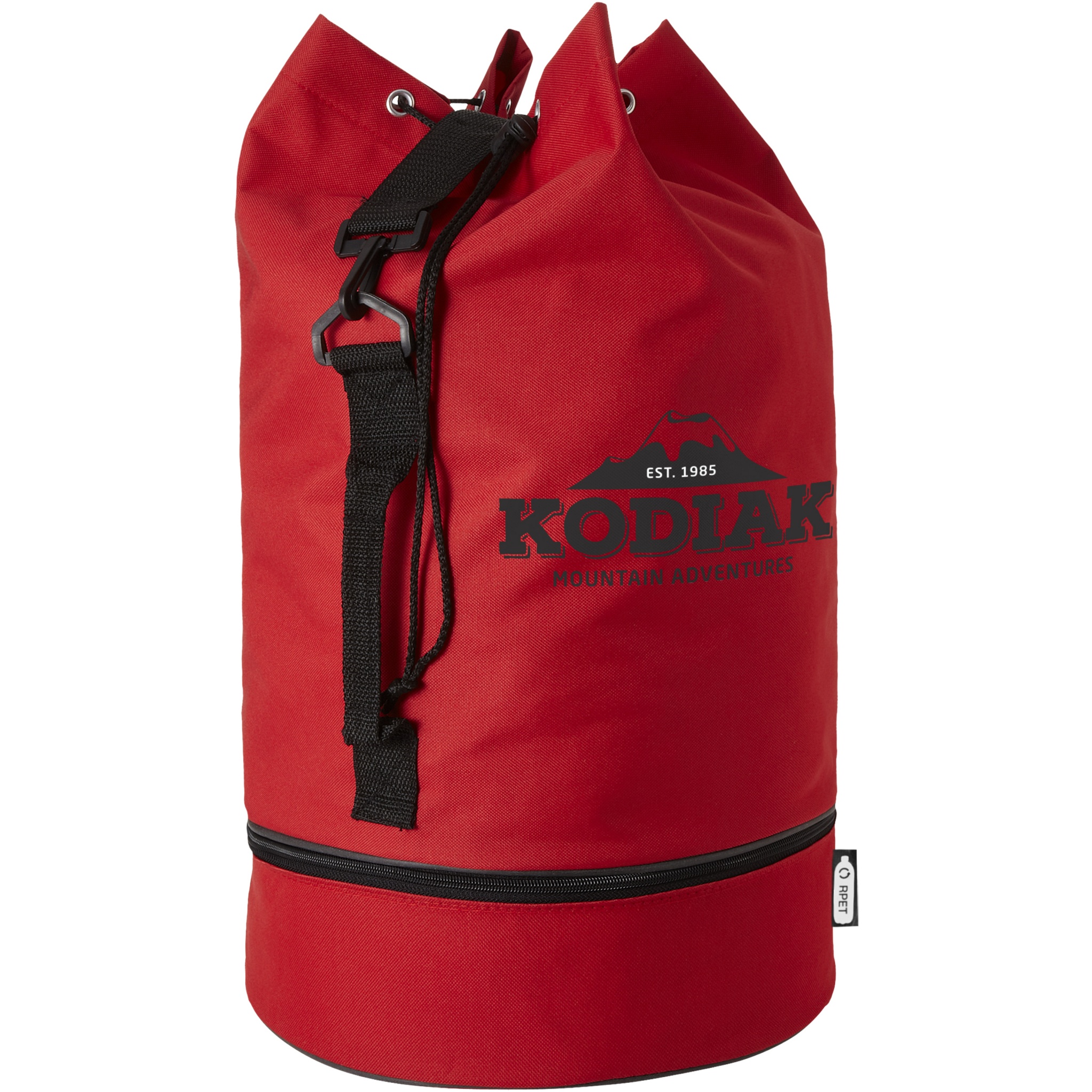 Vedenpitävä merimieslaukku kierrätetystä PET-muovista. Tilava 20 litran päälokero, jossa on kiristysnyöri, sivukahva ja säädettävä olkahihna. Erillinen vetoketjullinen alalokero pikkutavaralle.