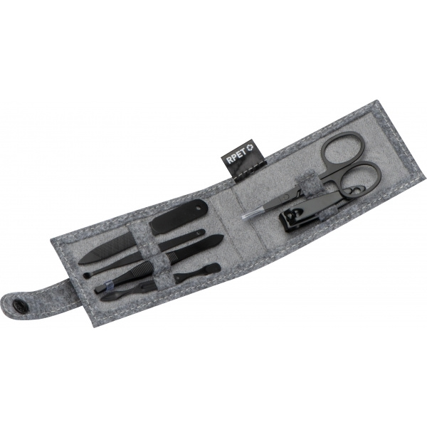 Houkutteleva manikyyrisetti huovasta (kierrätetty PET). Sisältää kynsisakset, kynsiviilan, kynsileikkurit, pinsetit ja kaksi kynsinauhojen työntölaitetta. Asetamme logosi kotelon etupuolelle.