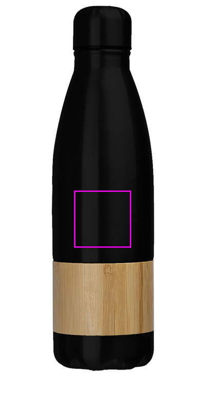 Ruostumattomasta teräksestä valmistettu pullo bamburenkaalla, vuotamattomalla korkilla ja tilavuudella 750 ml. Logosi kaiverretaan pulloon.
