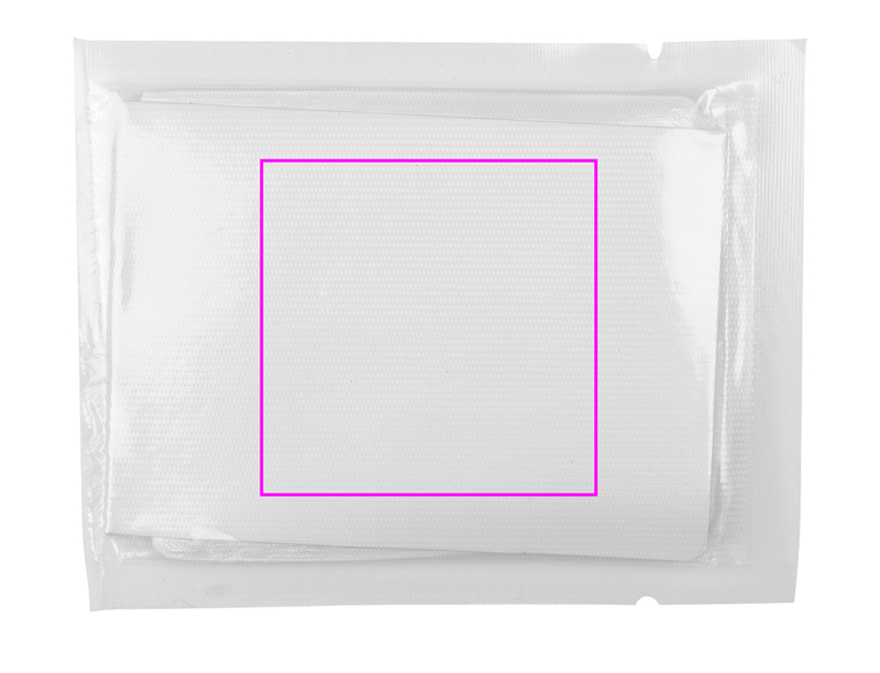 Pienikokoiseen pakkaukseen (8,5 x 6 cm) taitettu sadeponcho. Painamme logosi pakkaukseen kiinnitettyyn tarraan. Taitettavan takin selkä - 113 x 78 cm.