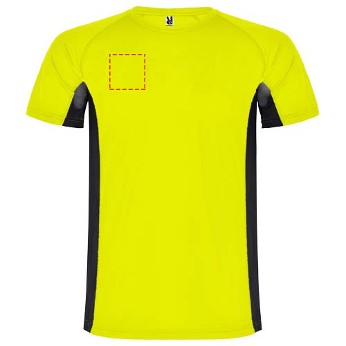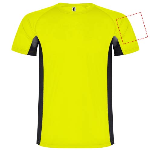 Tekninen ja hengittävä kangas. Kahden polyesterikankaan yhdistelmä: Pääkangas bird's eye -kangasta, reunaosat ja hihan sisäpuoli mikrokuitukangasta. Pyöreä pääntie, jossa vahvistetut koristesaumat sisäpuolella. Irrotettava etiketti.