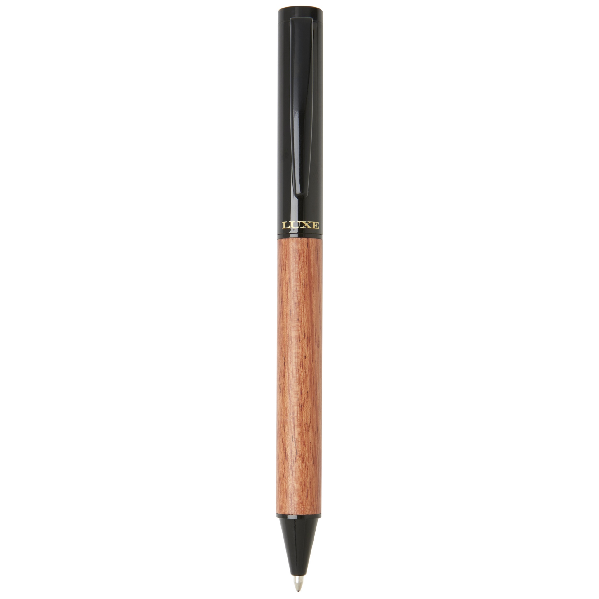 Ylellisesti muotoiltu kierrettävä kuulakärkikynä, jossa on puinen alaosa. Musta muste, pakattu LUXE-lahjapakkaukseen.