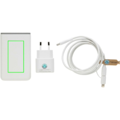 3 gab 20W ātrās uzlādes komplekts mobilajām ierīcēm un citām mazām ierīcēm. Ar ES adapteri ar 20 W USB C pieslēgvietu, 5000 mAh barošanas bloku un 120 cm pārstrādātu TPE 60 W ātrās uzlādes kabeli (no USB C uz USB/Lightning). Kabelis atbalsta datu pārsūtīšanu un arī lielāku ierīču, piemēram, klēpjdatoru, uzlādi. Adapteris, barošanas bloks un kabelis izgatavoti no RCS sertificēta pārstrādāta datora, ABS un pārstrādāta TPE. Iepakots maisiņā, kas izgatavots no RCS sertificēta pārstrādāta PET. Kopējais otrreizējās pārstrādes saturs visā komplektā: 59% no kopējā preces svara. RCS sertifikācija nodrošina pilnībā sertificētu pārstrādāto materiālu piegādes ķēdi. Iepakots FSC® iepakojumā. Bez PVC. Ieejas sienas lādētājs AC 100-240V 50/60Hz 0,6A; Izejas sienas lādētājs USB-C: 5.0V⎓3.0A,9.0V⎓2.22,12.0V⎓1.67A (maksimāli 20W). Izejas barošanas bloks 5V⎓2,4A -USB-C ieeja: 5V⎓2,4A