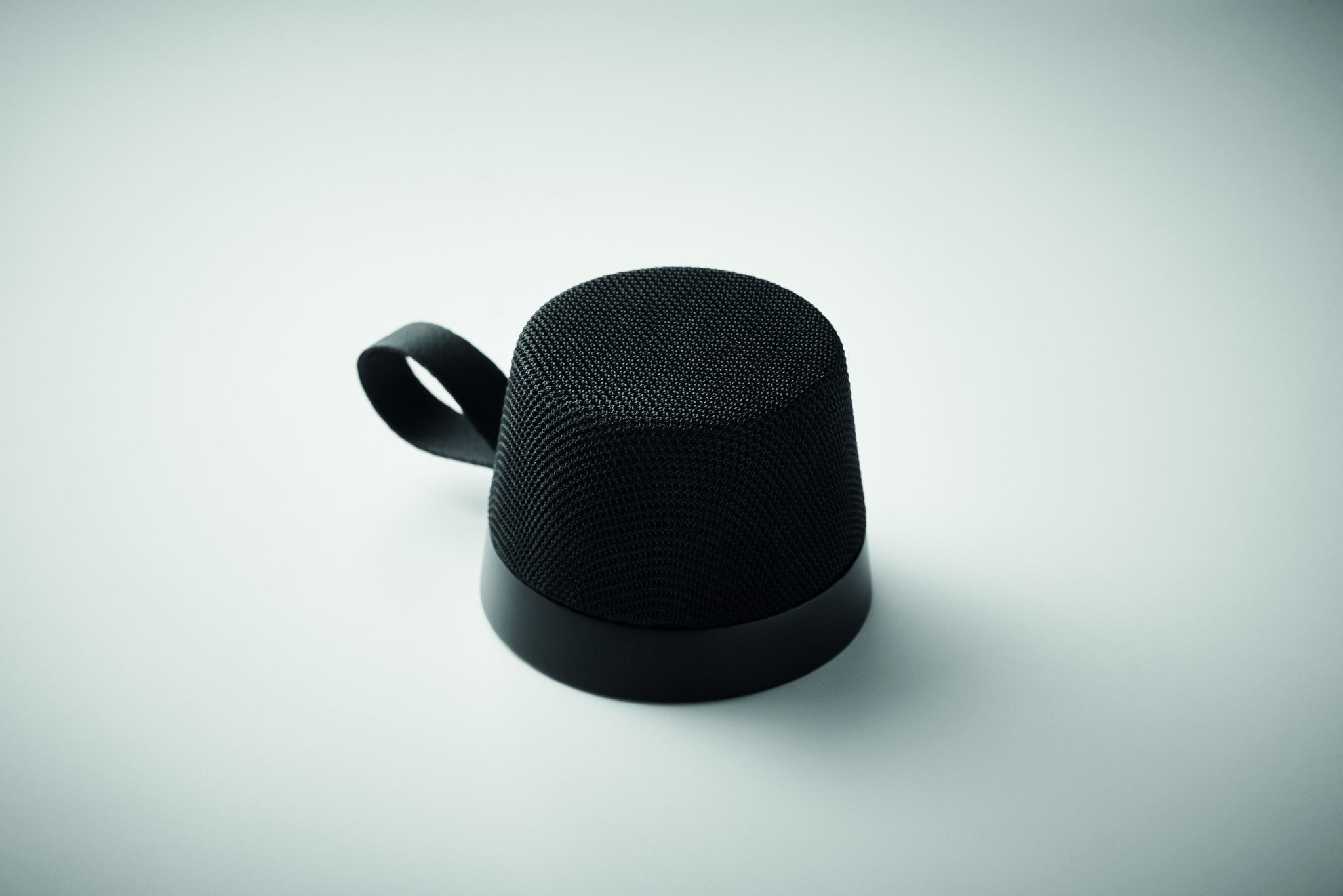 4.2 wireless speaker in ABS casing, RPET polyester fabric and loop. Magnet on back part supports stand functionality. Rechargeable Li-ION 300 mAh battery included. Output data: 3W, 4 Ohm and 5V. Playing time approx. 2hours.