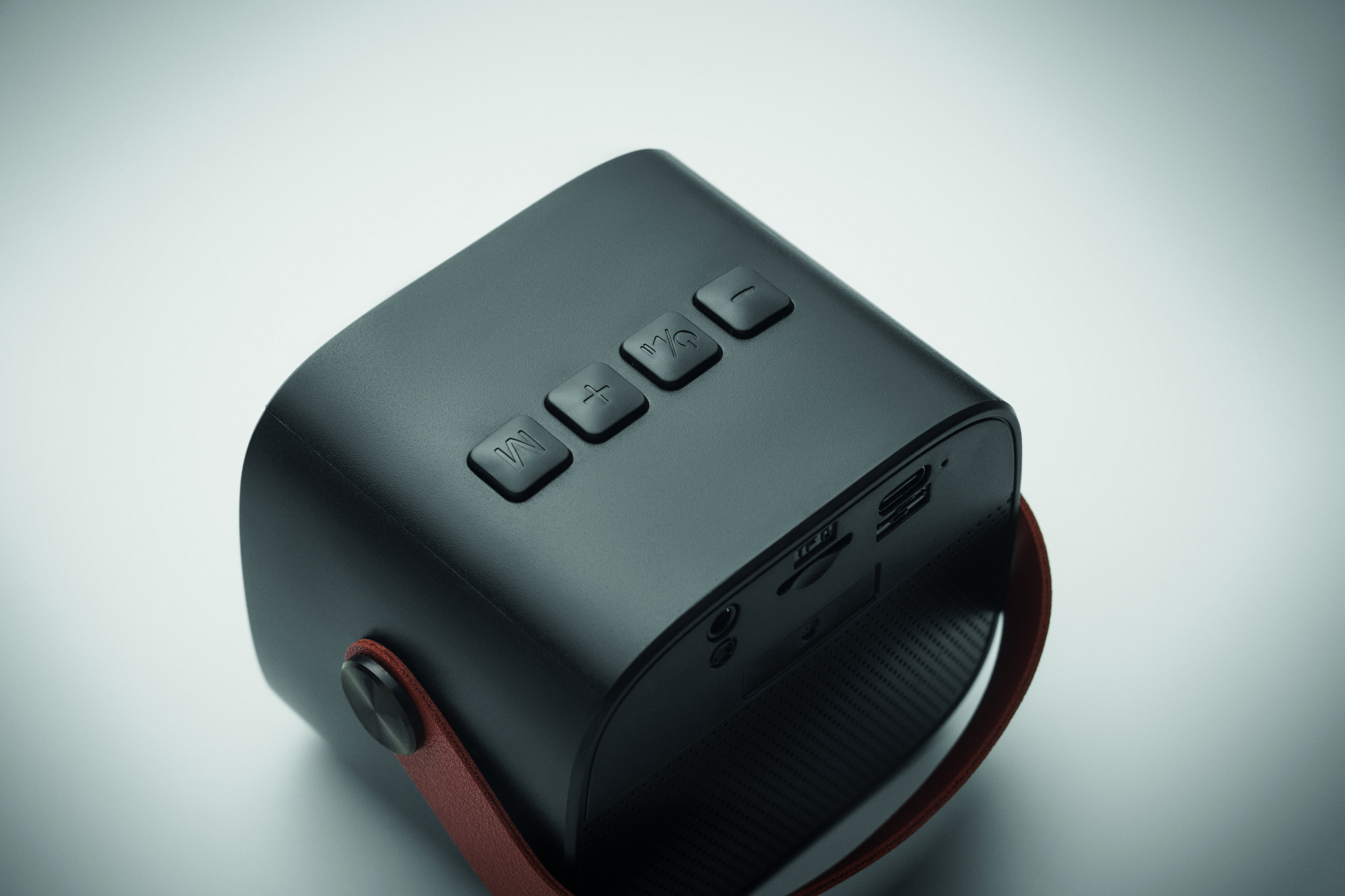 5.0 wireless speaker in recycled ABS with PU handle. 1 Rechargeable Li-ION 500 mAh battery included. Includes an SD card port and an AUX/ USB cable. Output data: 5W, 3 Ohm and 5V. Playing time approx. 4h.