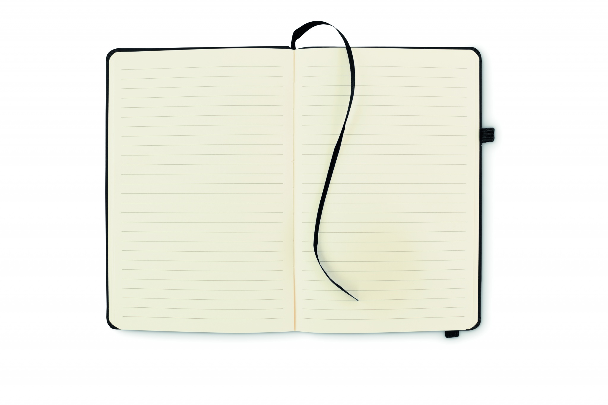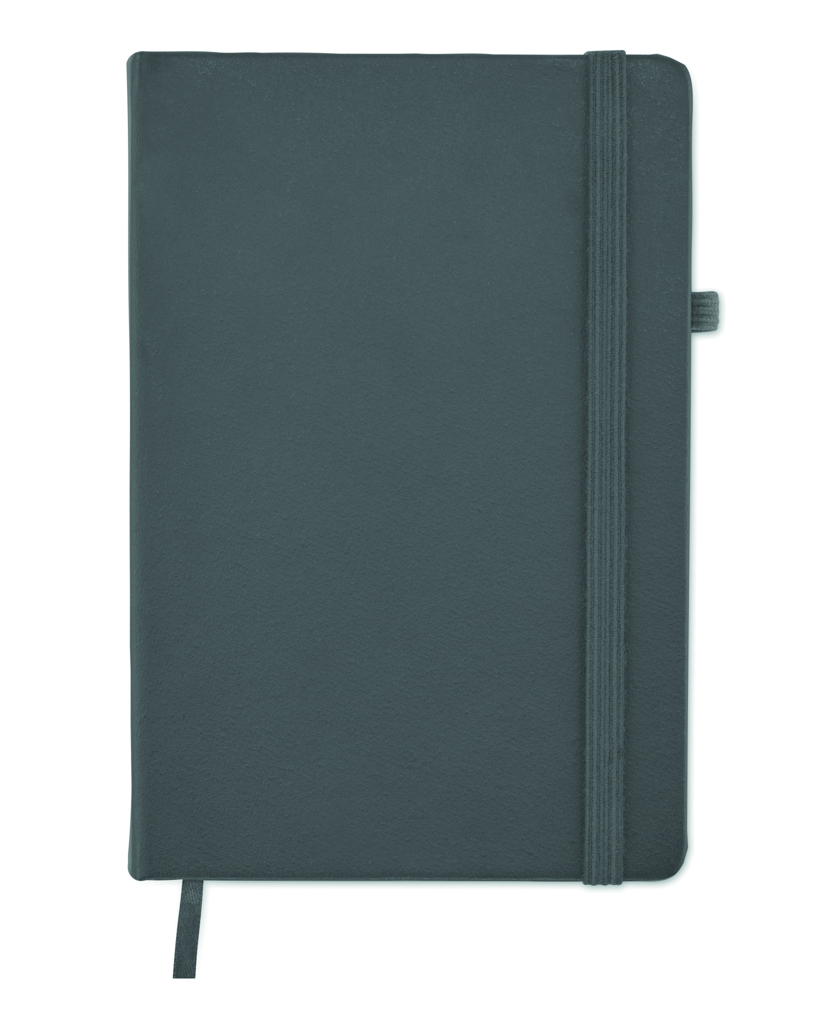 Блокнот формата A5 с обложкой из переработанного полиуретана. Переплет. 192 линованные страницы из переработанной бумаги (96 листов). Эластичный ремешок и крепление для маркеров и ручек.