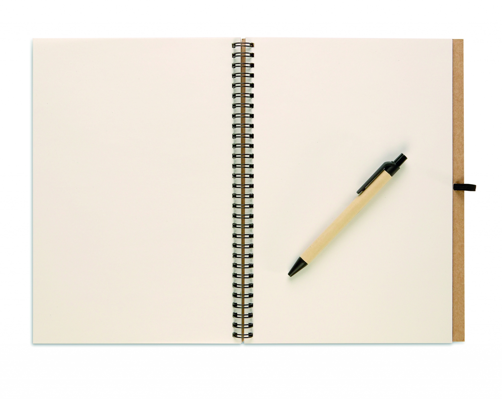 Блокнот с картонной обложкой. Включает 70 страниц вторично переработанной бумаги и синюю шариковую ручку из биопластика.