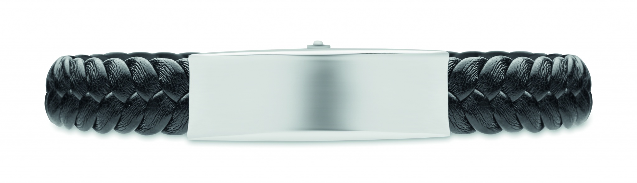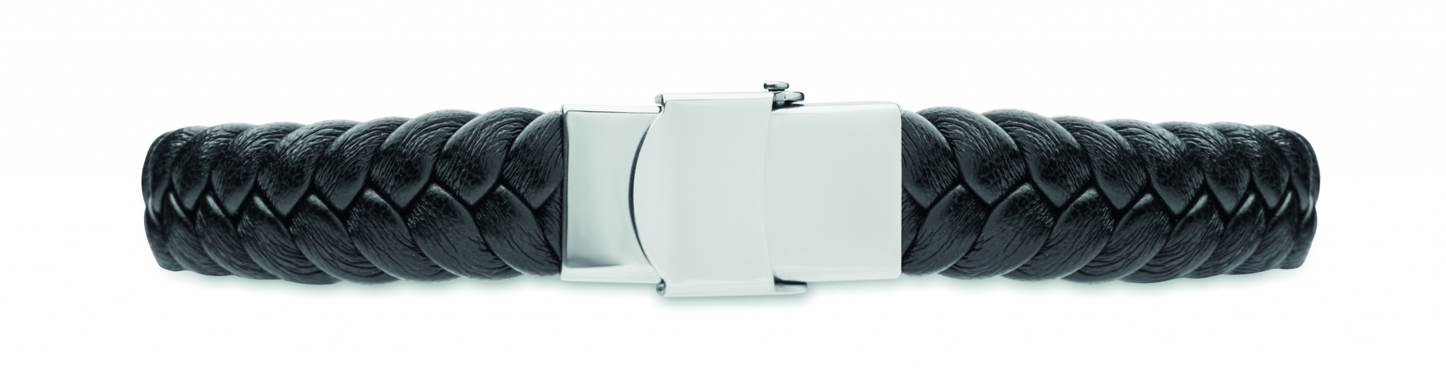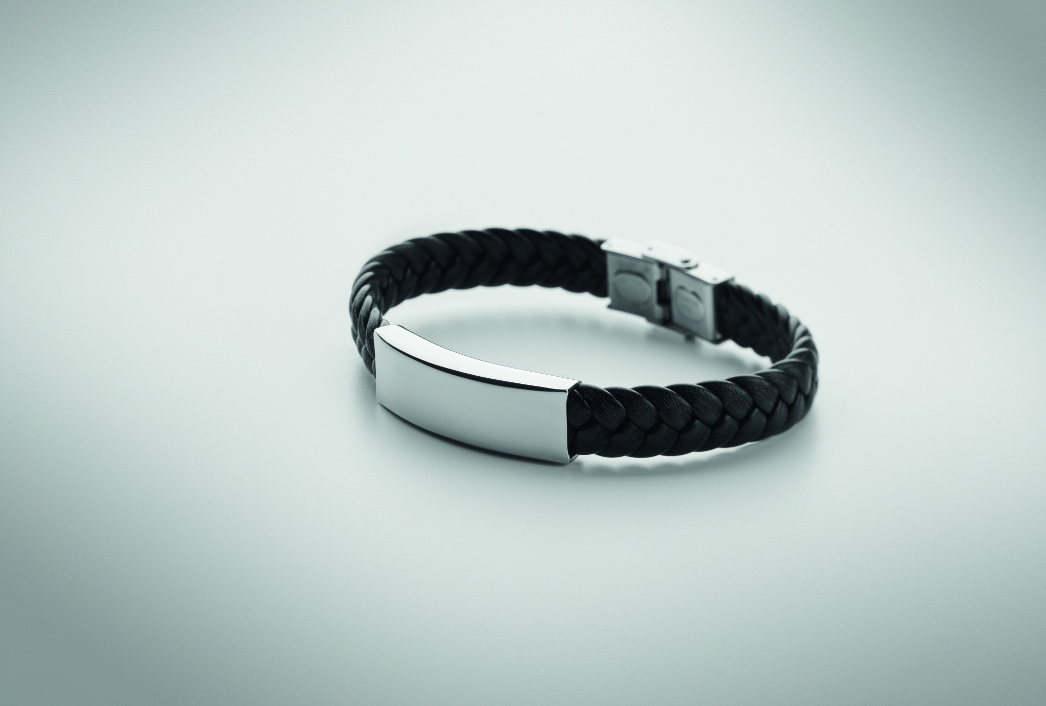 Плетеный браслет из искусственной кожи с фурнитурой из полированной стали. Застежка-защелка. Обхват запястья: 21 см.
