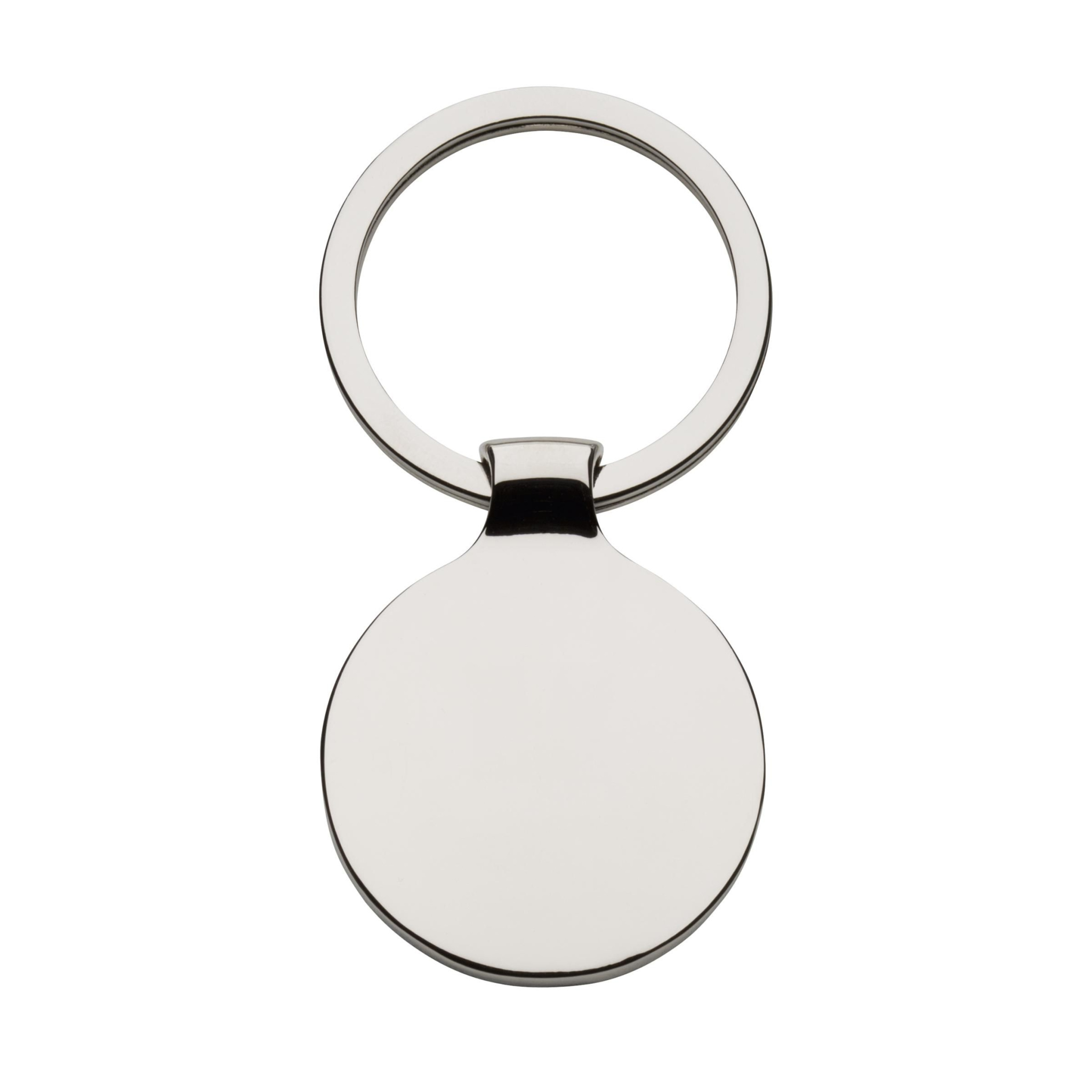 Круглый, полированный, никелевый металлический брелок с черной инкрустацией и прочным брелоком. Каждый предмет поставляется в индивидуальном коричневом картонном конверте.
