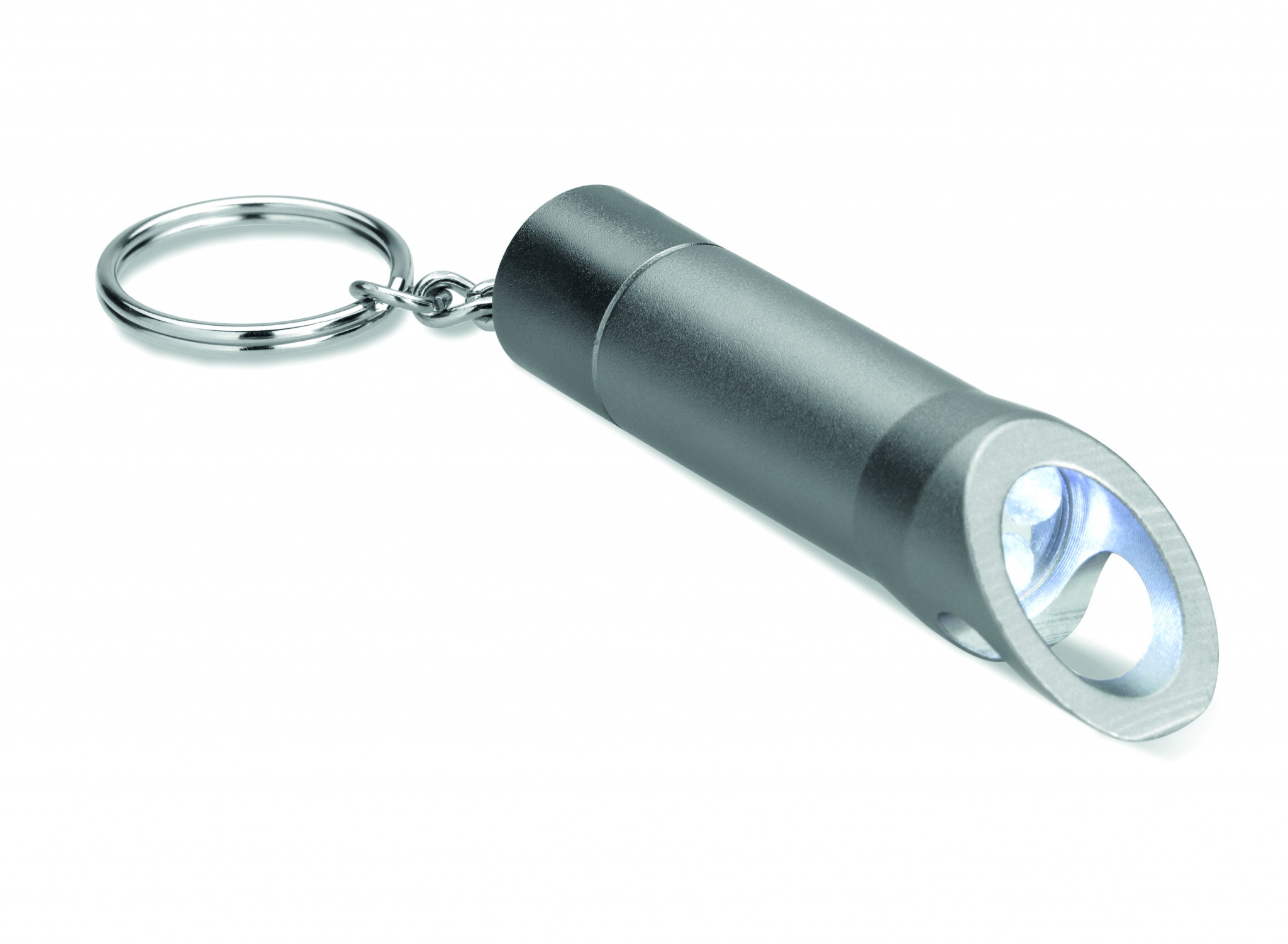 Металлический брелок с функциями LED фонарика и открывалки. Батарейки включены.