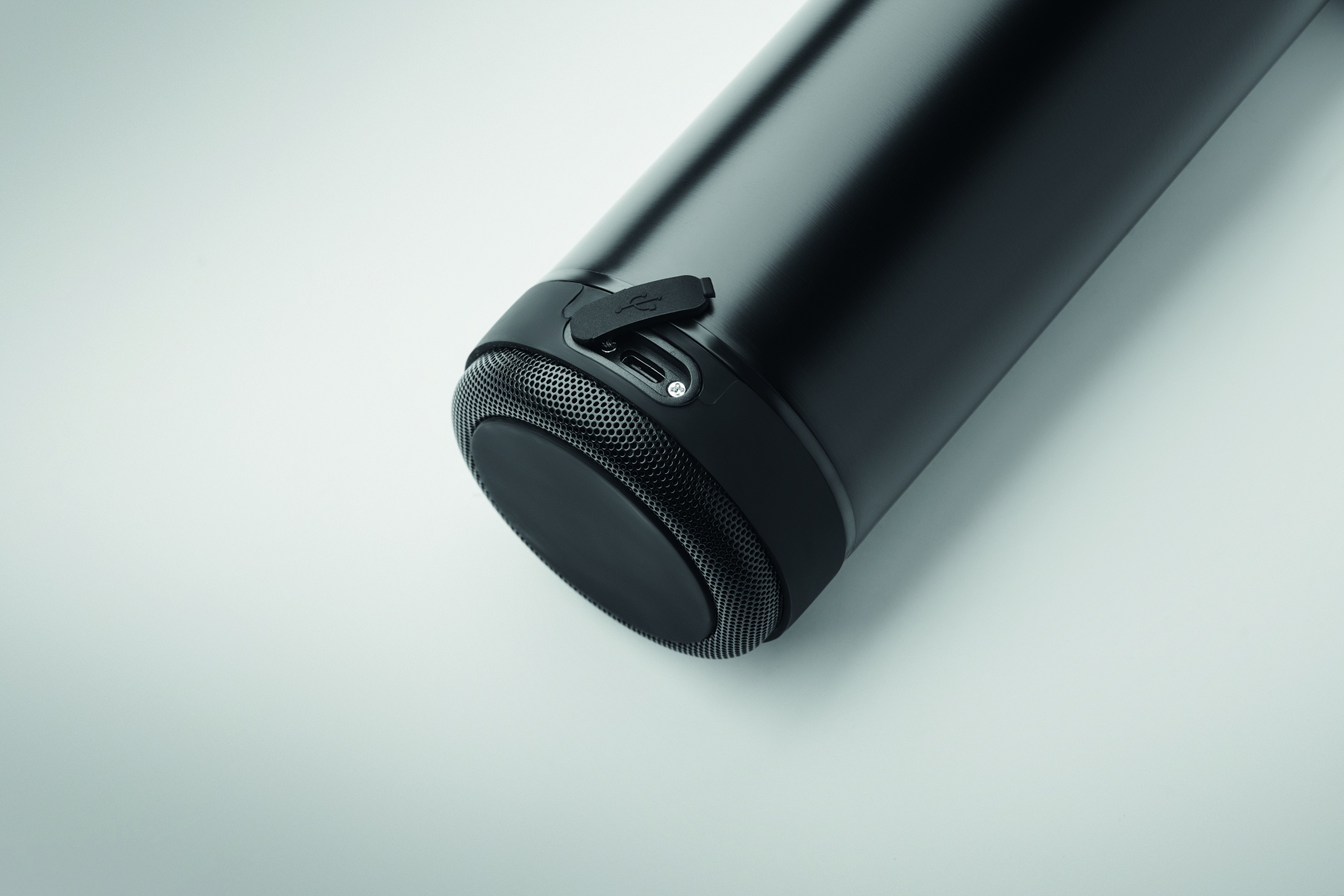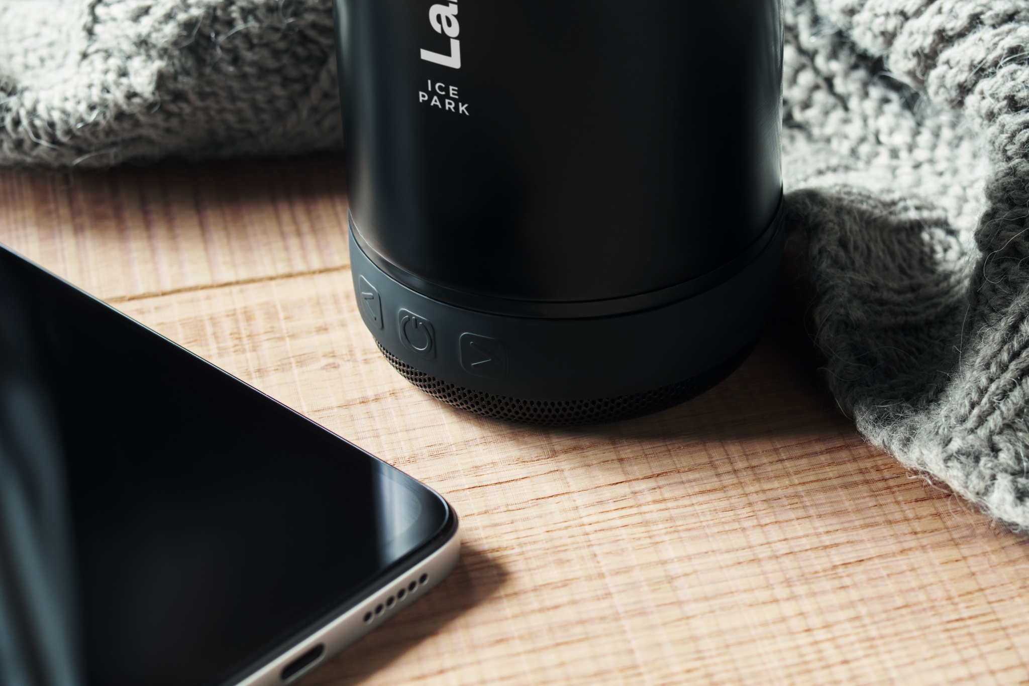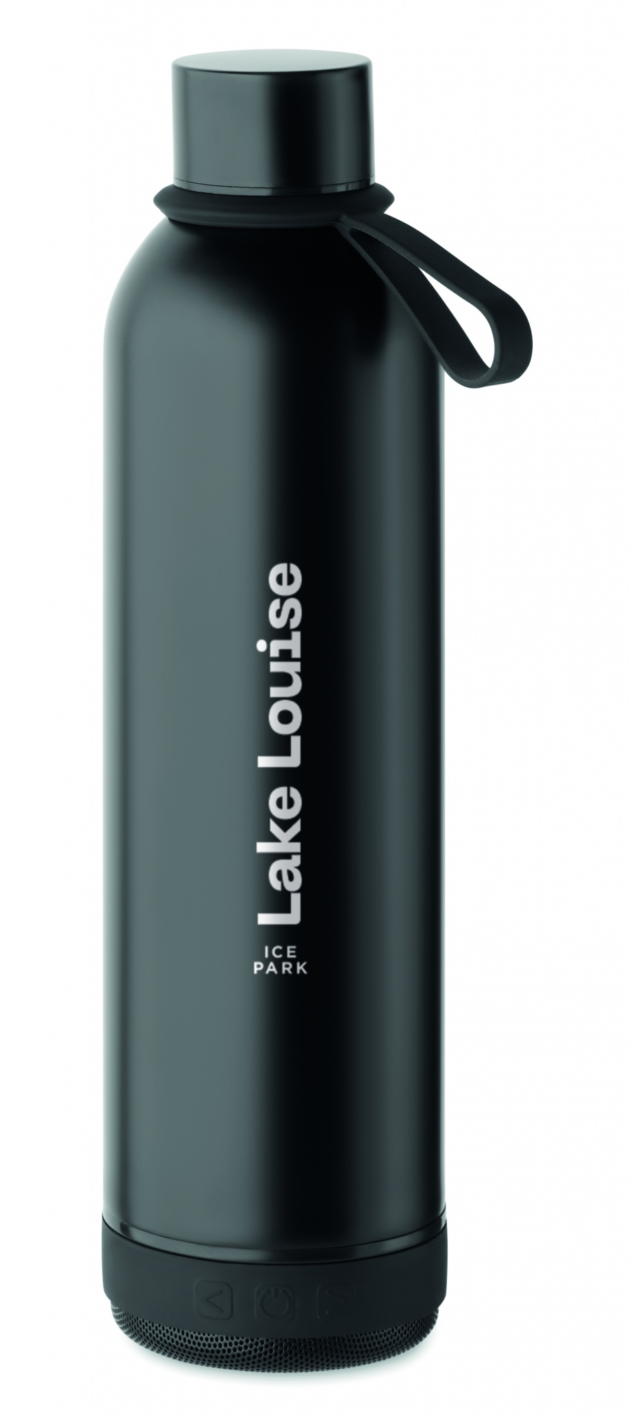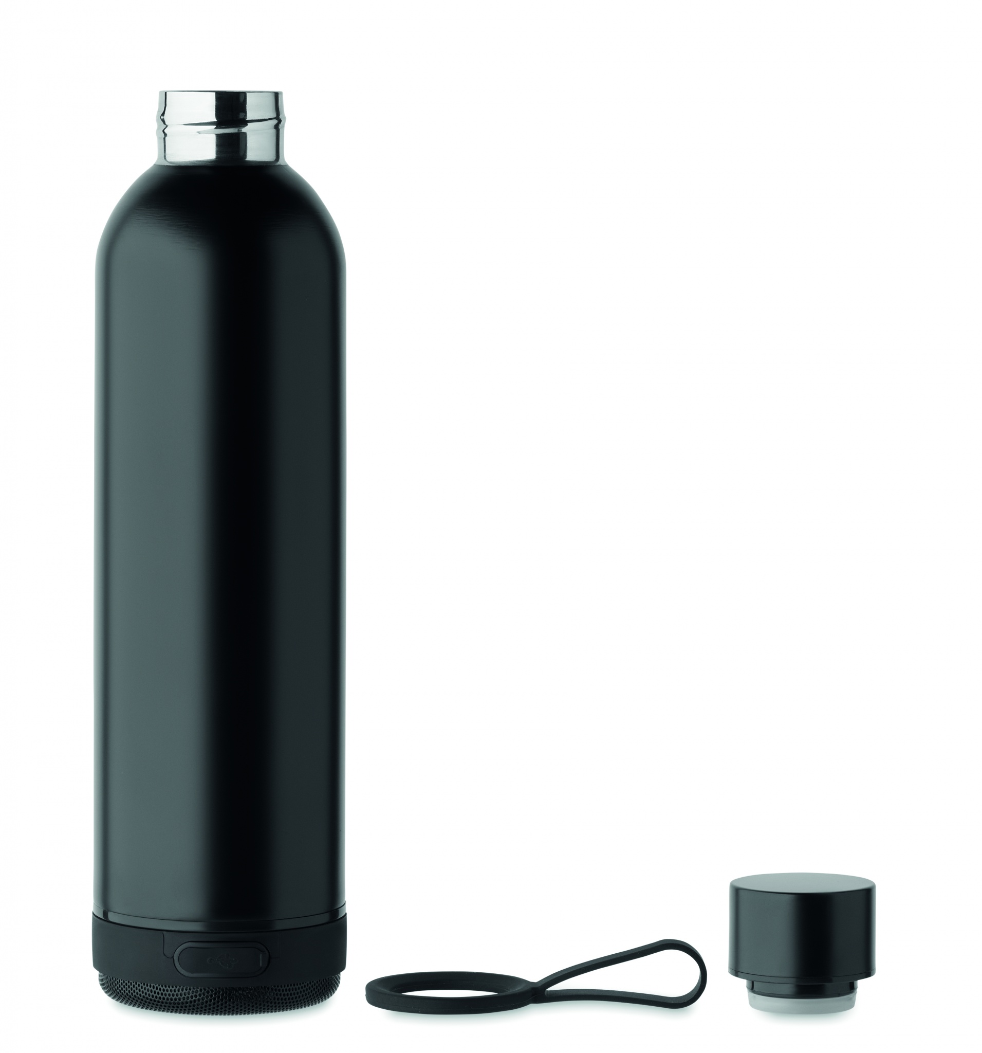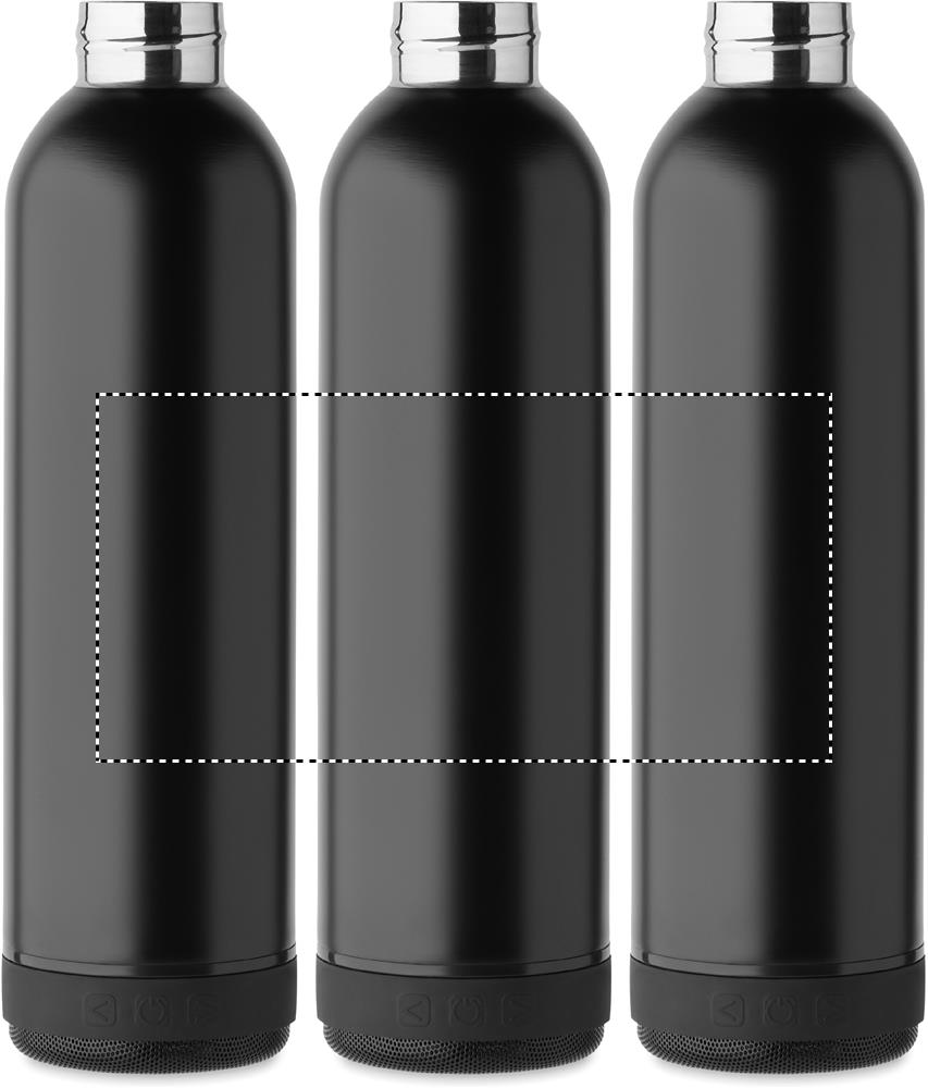 Бутылка с двойными стенками из переработанной нержавеющей стали (90%) и обычной нержавеющей стали (10%), силиконовый ремешок для переноски с отсоединяемой беспроводной колонкой 3 Вт. Объем: 500 мл. Аккумулятор 500 мАч. Отсоедините колонку, чтобы помыть бутылку. Герметична.