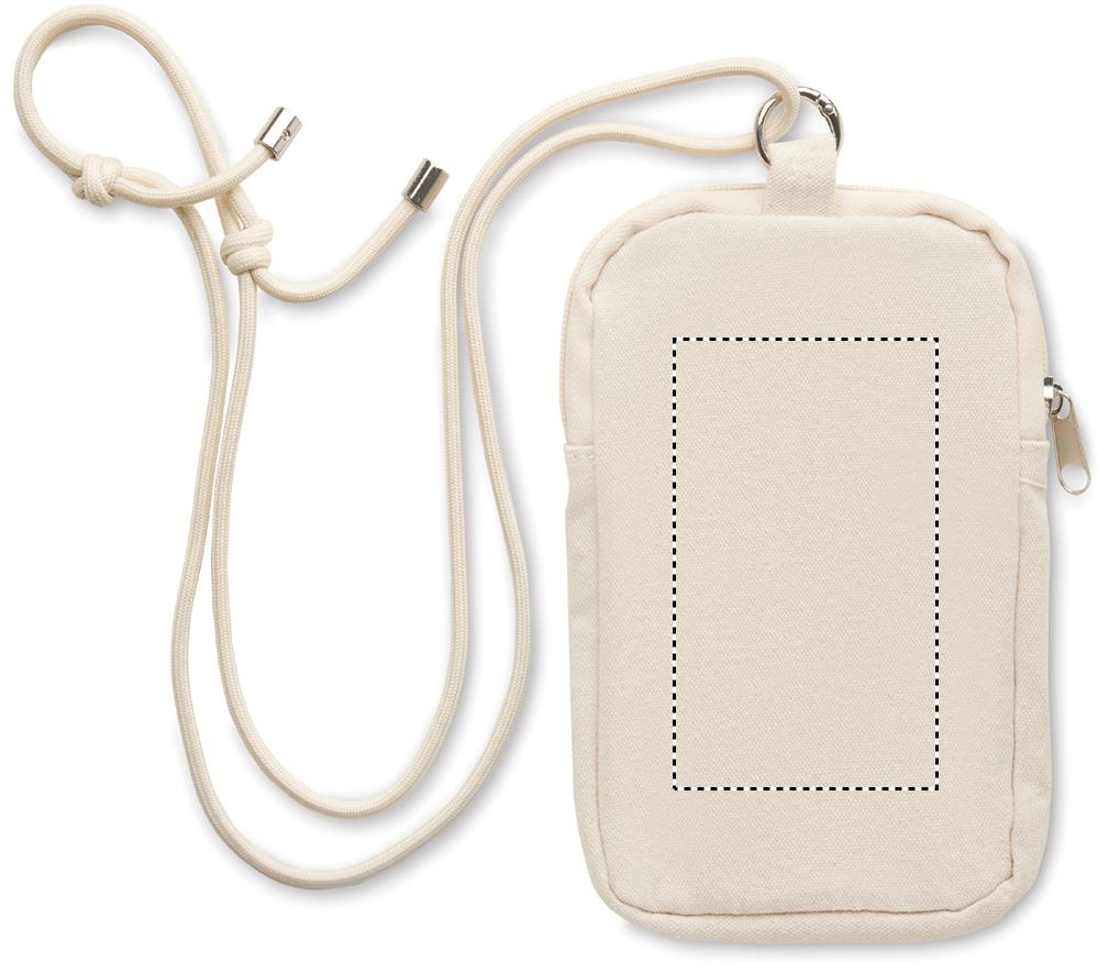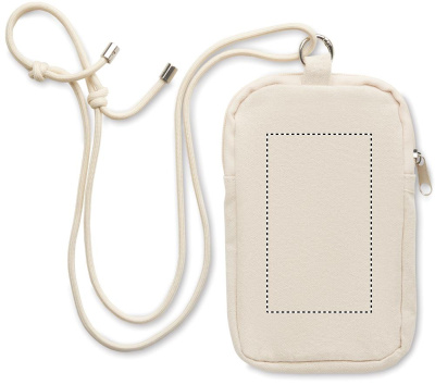 Cross body smartphone bag in recycled cotton with RPET polyester adjustable lanyard with open pocket on front side. 280 gr/m².