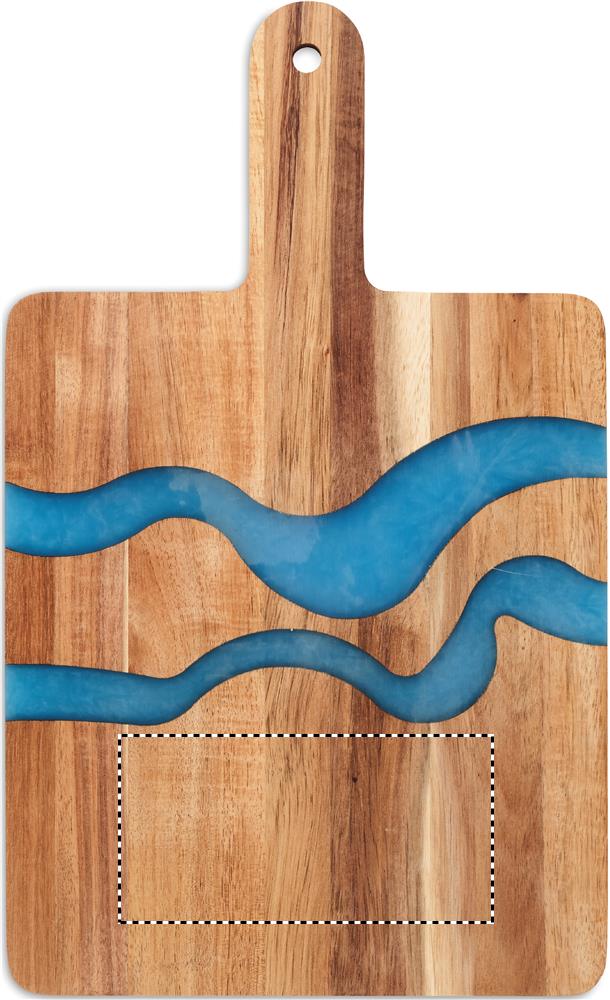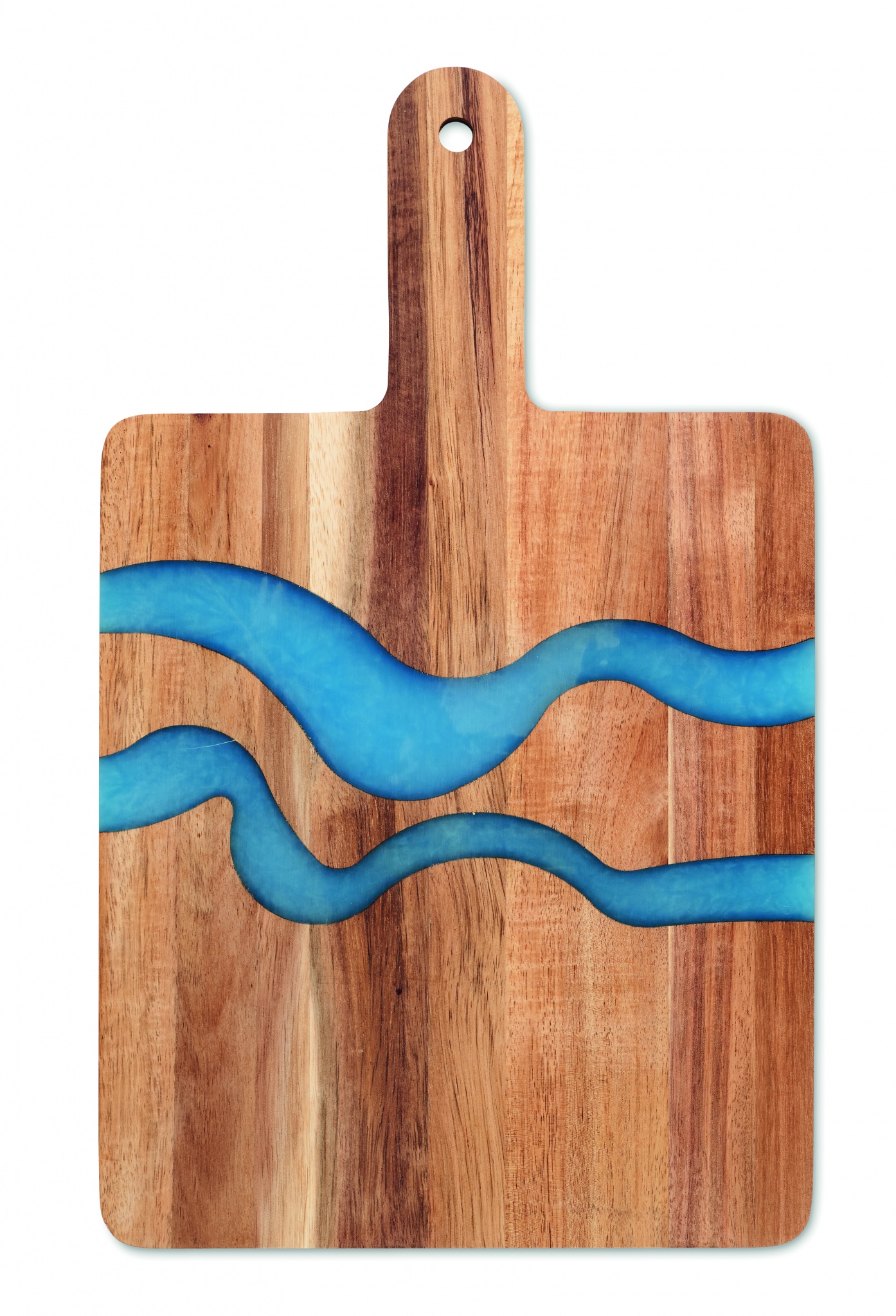 Сервировочная доска из древесины акации с украшением из эпоксидной смолы и ручкой.